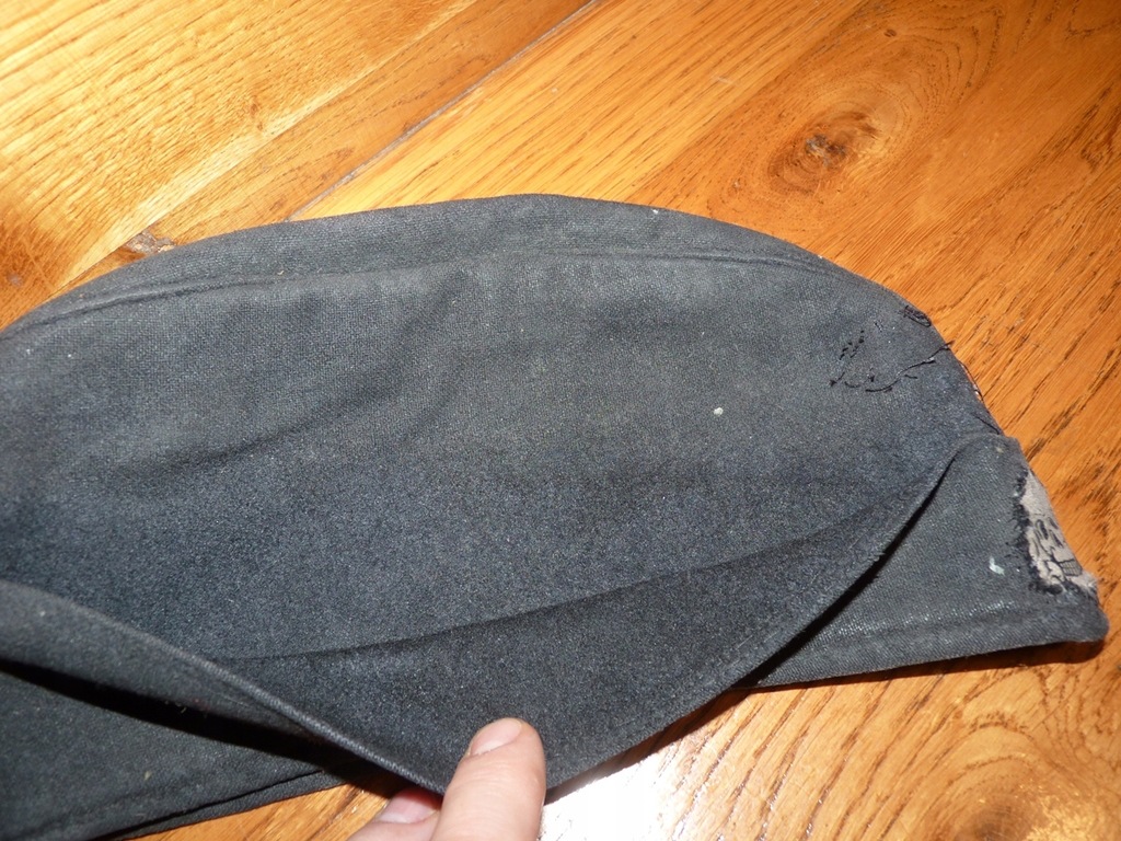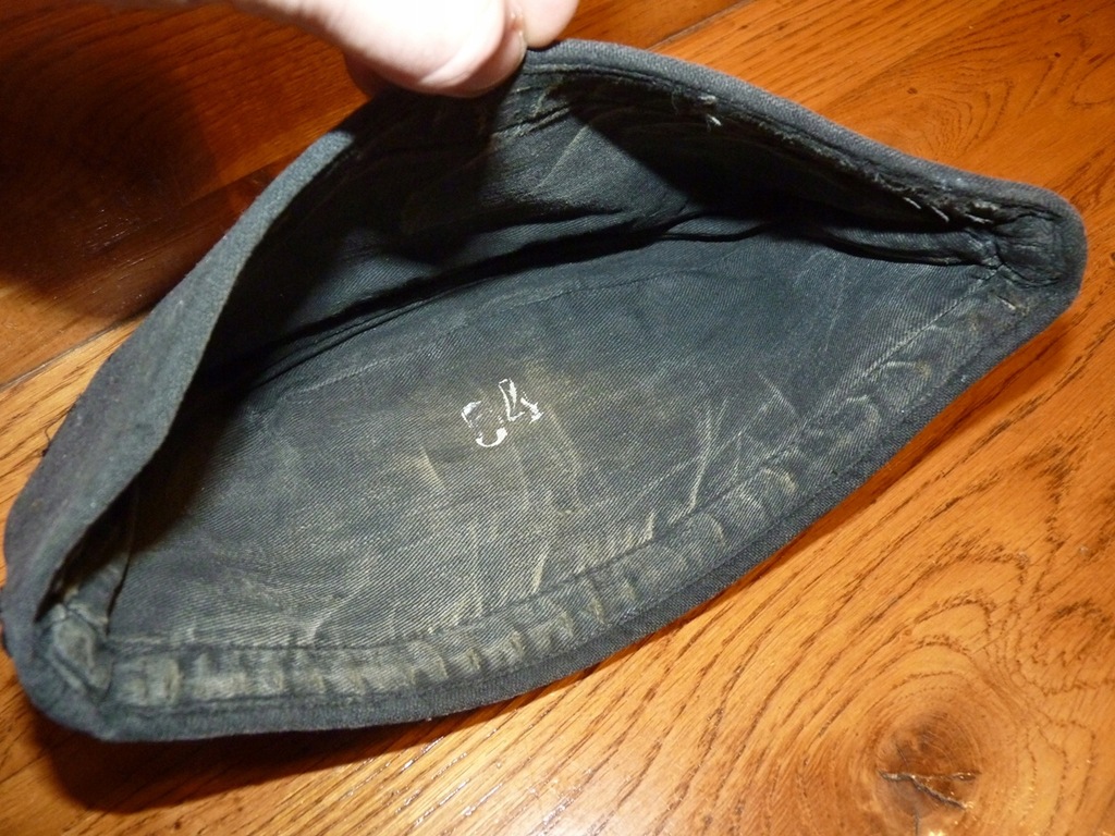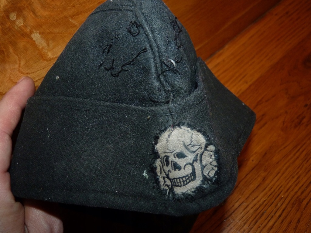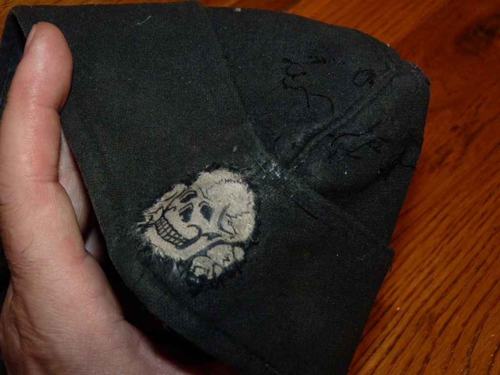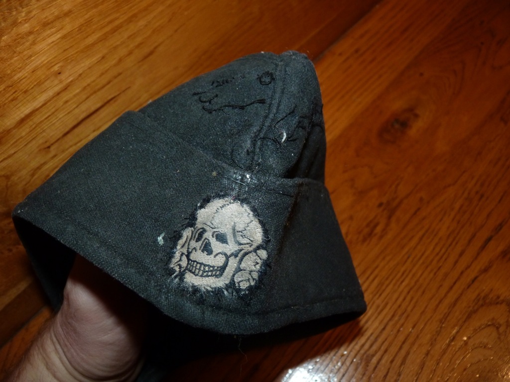 Oryginalna czapka wojsk pancernych SS, furażerka, stan dobry, sygnowana wewnątrz rozmiarem, ślad po orzełku, czaszka oryginalnie przyszyta
