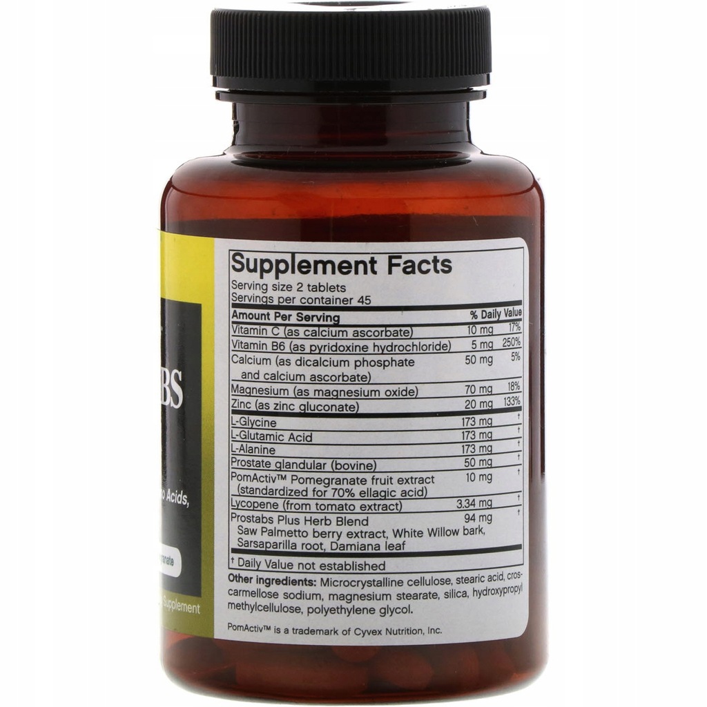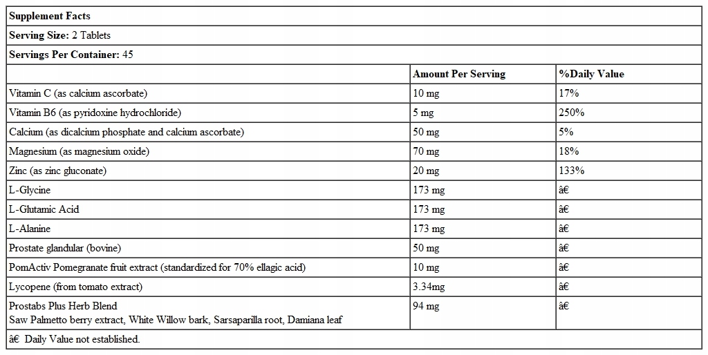 Prostabs Plus® to synergiczna kombinacja wyselekcjonowanych składników odżywczych, w tym likopenu, prostaty, aminokwasów i ekstraktu z palmy sabałowej, przeznaczona dla współczesnego dbającego o zdrowie mężczyzn. Ponadto do formuły dodano ekstrakt z granatu. Granat zawiera kluczowy związek zwany kwasem elagowym, który, jak wykazały badania, jest korzystny dla zdrowia.
