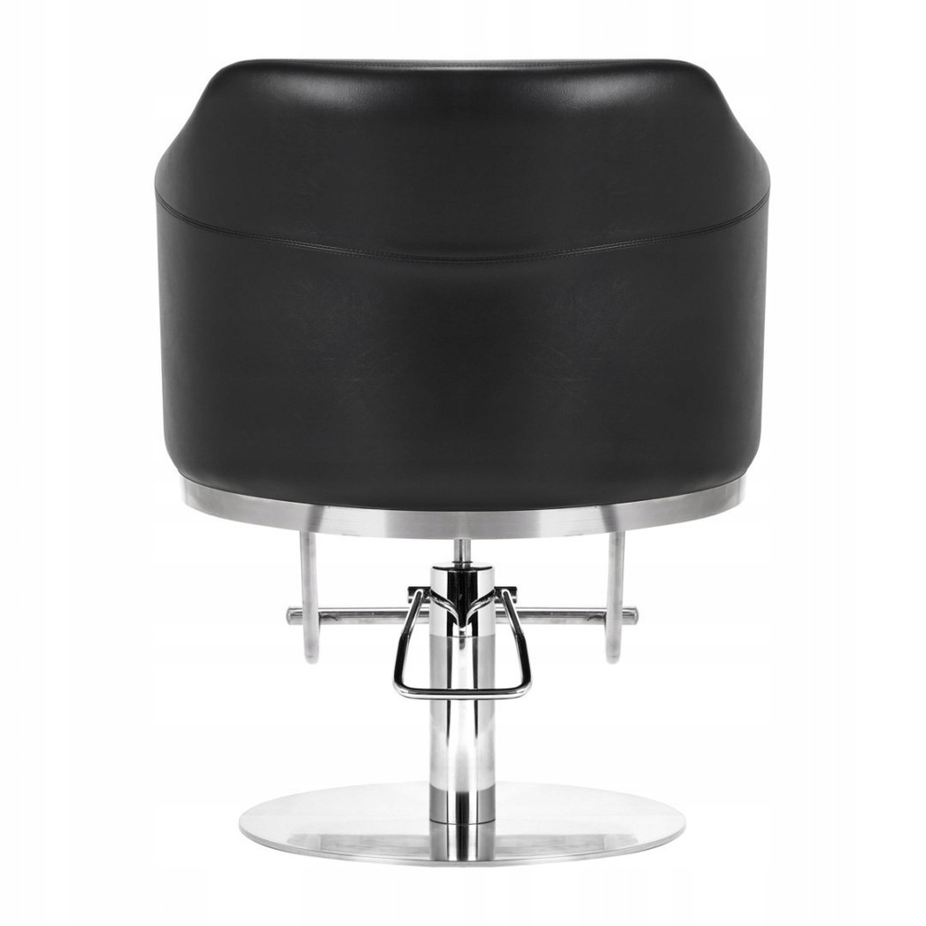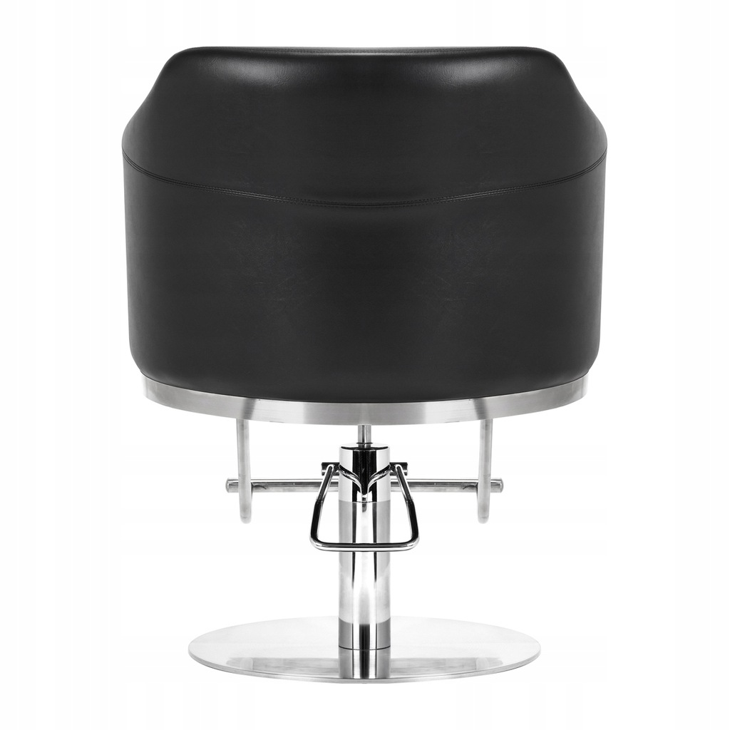 Solidna, okrągła podstawa zapewnia stabilność w trakcie użytkowania. Gładka powierzchnia sprawia, że element ten jest łatwy do utrzymania w czystości. Szerokie siedzisko, wypełnione pianką o odpowiedniej twardości, gwarantuje wysoki komfort użytkowania i wygodę nawet podczas wielogodzinnych zabiegów. Podłokietniki znajdują się na wysokości, która pozwala na prawidłowe ułożenie barków klienta – sprawia to, że nie chowa głowy w ramionach ani się nie garbi – wyraźnie usprawniając zabiegi, w tym strzyżenie. Ułatwia to precyzyjne wykonywanie usług.