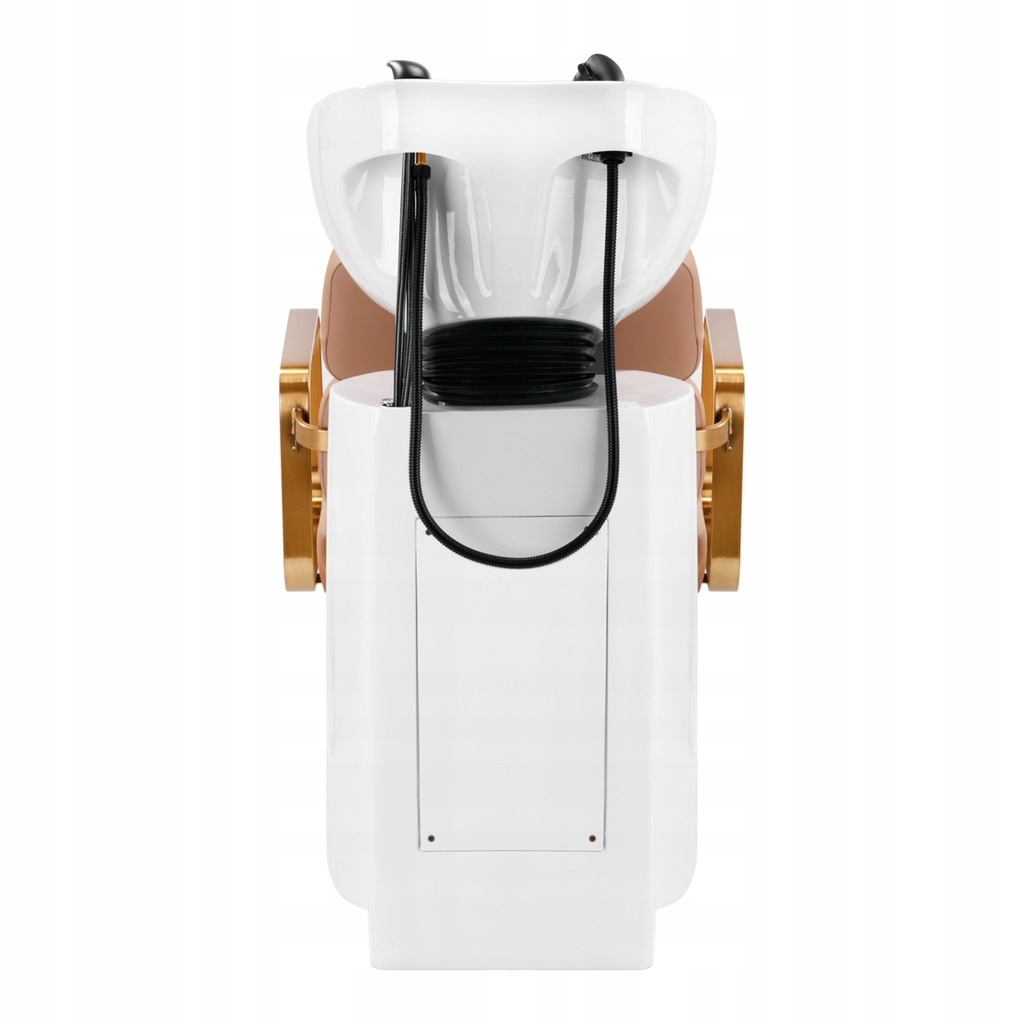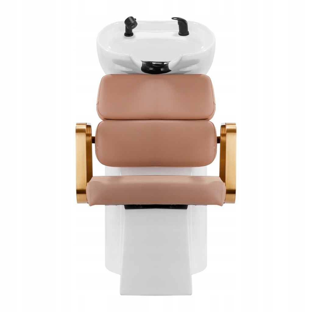 Wyprofilowany fotel zapewnia odpowiednie wsparcie lędźwi, a co za tym idzie wysoki komfort użytkowania. Metalowe podłokietniki w odcieniach złota o geometrycznym kształcie pozwalają na prawidłowe ułożenie barków klienta. Wypełnienie z trwałej, odpornej na odkształcenia pianki oraz obicie wykonane z przyjemnej w dotyku skóry syntetycznej w odcieniach beżu zapewniają trwałość mebla, łatwość czyszczenia i komfortowe użytkowanie przez długi czas. Oryginalny, elegancki wygląd myjni nadaje wnętrzom niepowtarzalnego wyrazu. W zestawie znajduje się kompletna armatura w odcieniach czerni, w tym bateria, słuchawka prysznicowa oraz dedykowane węże, aby zapewnić kompletny zestaw narzędzi do pracy.