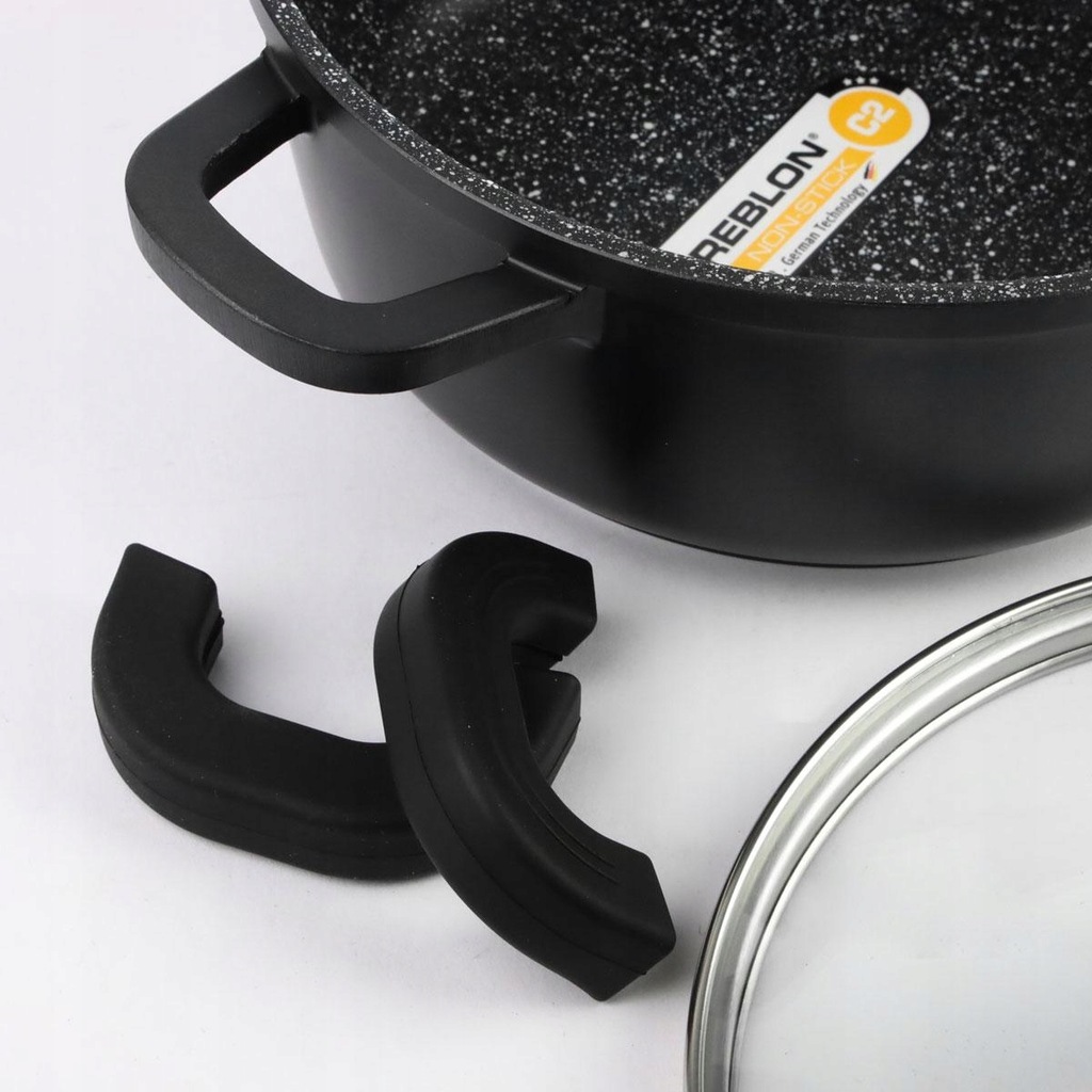 W zestawie dodatkowo znajdują się zdejmowane silikonowe uchwyty. Umożliwiają one bezpieczne przenoszenie i wyjmowanie z piekarnika gorącego garnka jednocześnie chroniąc dłonie przed oparzeniami.