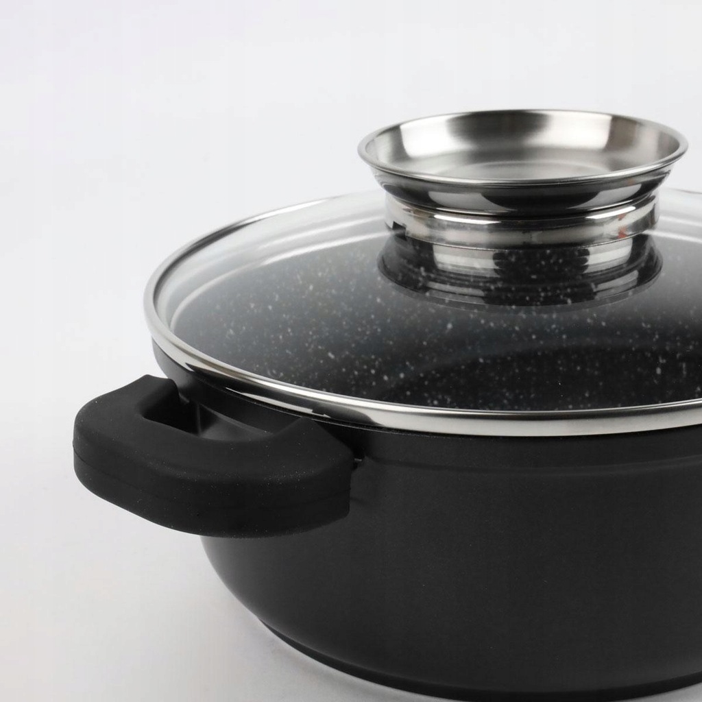 Niski garnek o okrągłym kształcie i pojemności 2,3 l. W komplecie z pokrywą. Z zewnątrz w całości pokryty czarnym, żaroodpornym lakierem, który jest odporny na zadrapania, odpryski i przebarwienia. Sprawia on, że garnek na długo zachowuje swój estetyczny wygląd.