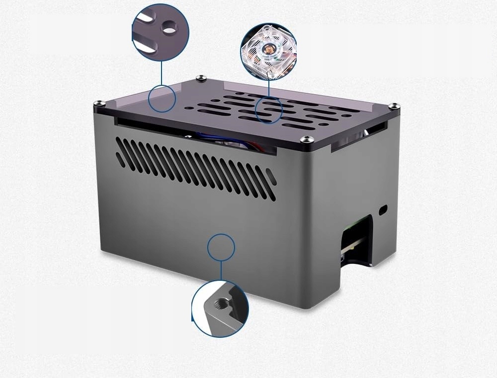 - Pakiet zawiera: 1 x aluminiowa obudowa z zestawem chłodzącym ICE Tower, 1 x płyta rozszerzeń SSD M.2 SATA (uwaga: Raspberry Pi nie jest dołączone!)