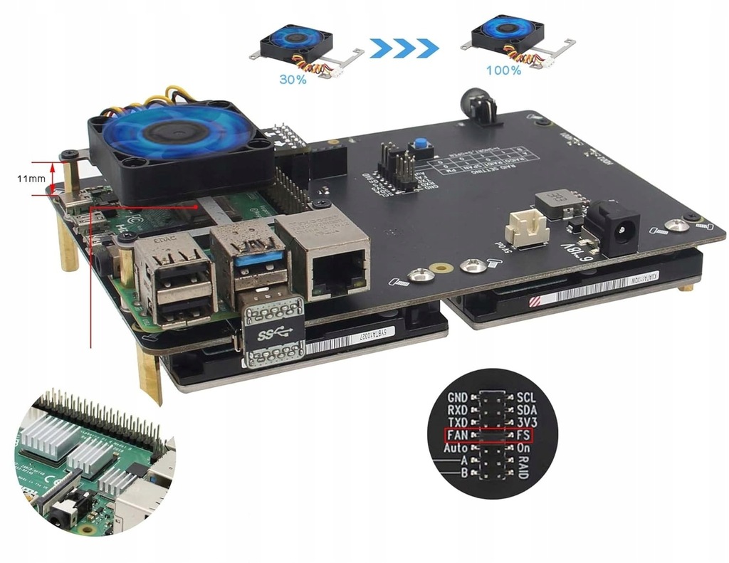 - Interfejsy: USB 3.0, Ethernet (przez Raspberry Pi), USB Typ C (dla Pi, nie do zasilania)