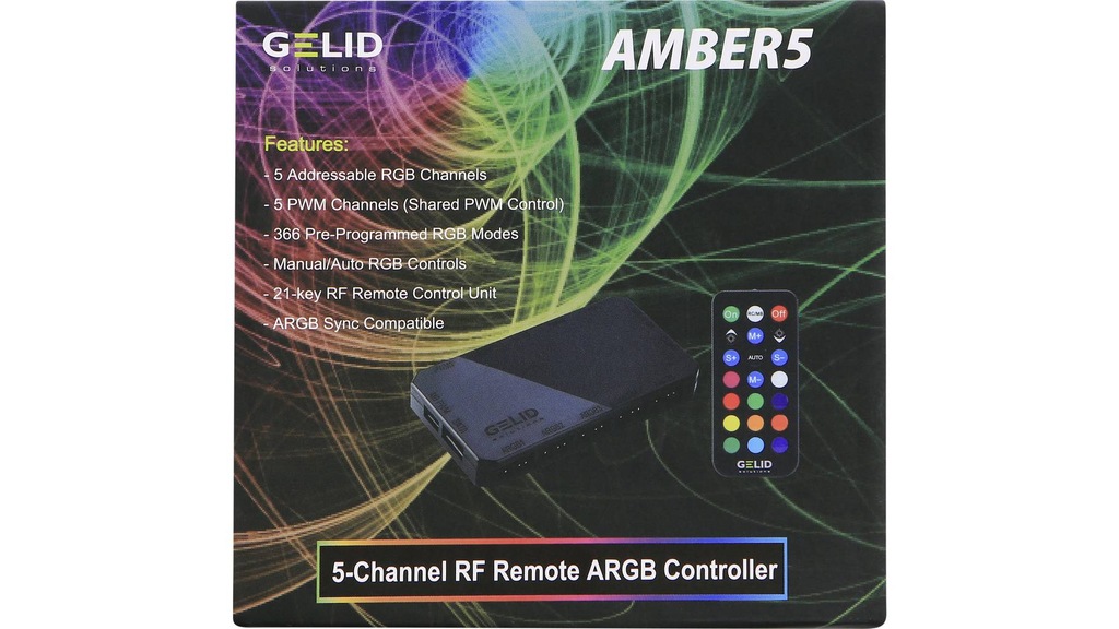 Kontroler ARGB Gelid Amber5 + HUB PWM Bezprzewodowy Pilot Radiowy. Spraw, aby konfiguracja podświetlenia była prosta i fajna! AMBER5 kontroluje do 5 wentylatorów, pasków LED lub innych adresowalnych urządzeń ARGB. Oferuje 366 żywych ustawień oświetlenia. Jest wyposażony w 21-klawiszowy pilot RF do wygodnej obsługi oraz złącze zasilania SATA zapewniające stabilną moc wyjściową. Można zainstalować w kilka sekund dzięki wbudowanemu magnesowi. Obsługuje również funkcje koncentratora ARGB za pośrednictwem 3-stykowego wejścia synchronizacji ARGB, gdy jest podłączony do zgodnych płyt głównych: ASUS, Gigabyte, MSI lub ASRock.