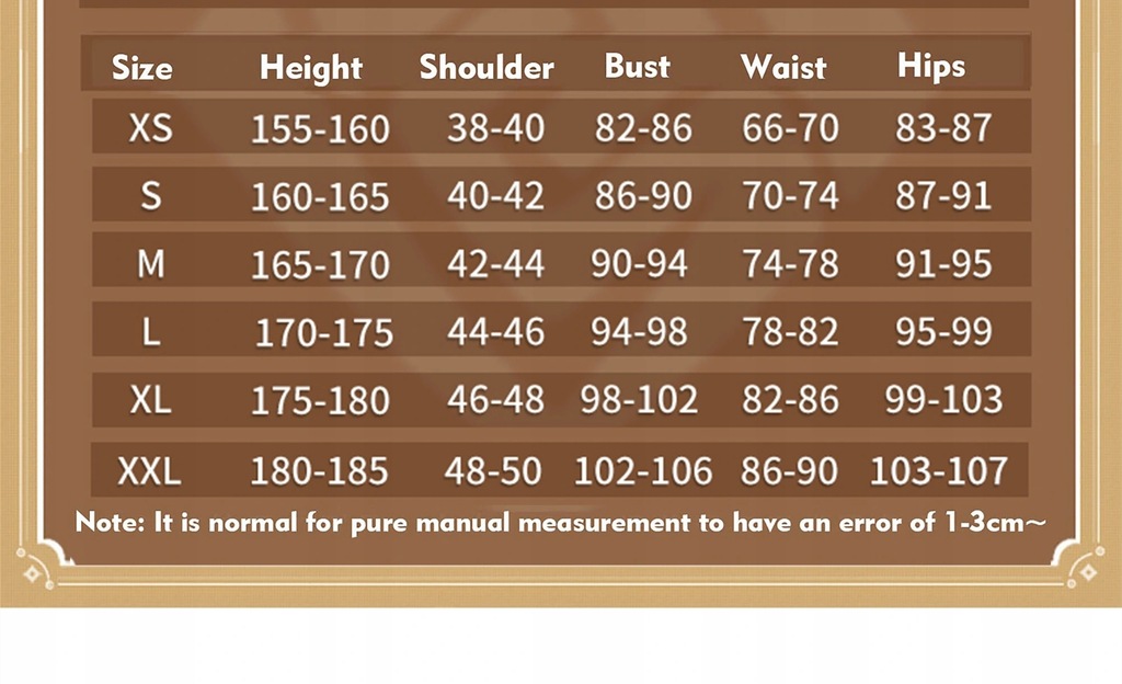 Materiał: Kostium Genshin Impact został wykonany z wysokiej jakości materiałów z drobnym krawiectwem. Oddychająca i wygodna, nie będzie niewygodna przy długotrwałym noszeniu.