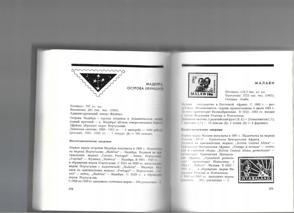 Geografia filatelistyczna - wydana w 1966 roku w Moskwie. Zawiera emitentów znaczków z całego świata - poza ówczesnym Związkiem Radzieckim. Zawiera zdjęcia i opisy kilku znaczków wydanych w danym kraju. Przykładowa strona widoczna na fot. 2 Zdjęcia czarno-białe. Opisy w jęz. rosyjskim. Stron 477. Stan bloku - spójny, kompletny. Stan obwoluty - naddarta. Stan okładki - twarda, płócienna w doskonałym stanie.
