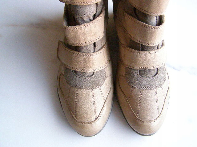 BOTKI USZYTE Z NAJLEPSZEJ JAKOŚCI CIELĘCEJ ZAMSZOWEJ I LICOWEJ SKÓRY W KOLORZE BEŻOWYM NA ELEGANCKIEJ I ODPORNEJ NA ŚCIERANIE PODESZWIE Z KAUCZUKU I WYGODNYM OBCASIE KOTURNIE WYSOKOŚCI 8,5cm. WKŁADKA Z NAJLEPSZEJ CIELĘCEJ SKÓRY.