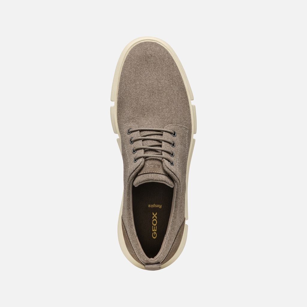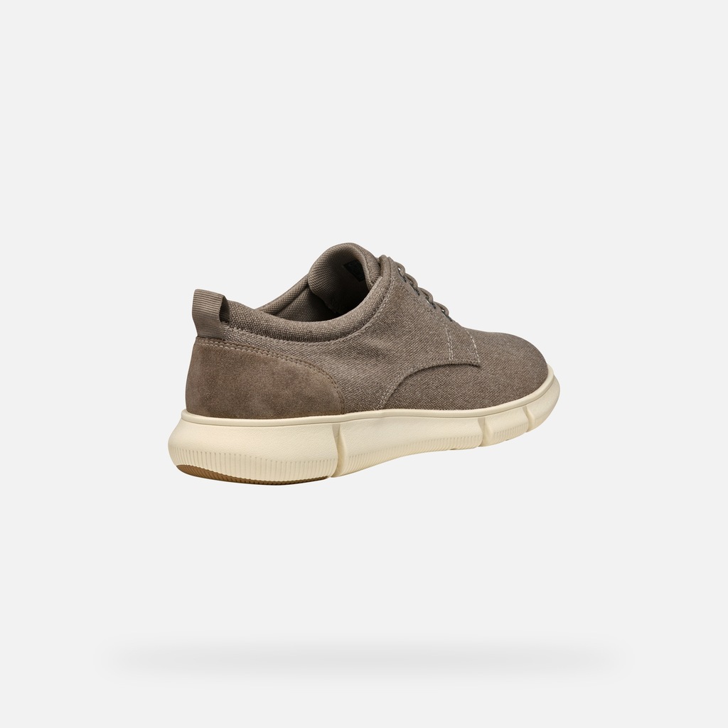 Jasnoszare buty wizytowe Geox Adacter F to eleganckie obuwie męskie z naciskiem na wygodę i funkcjonalność. Ich minimalistyczny design uzupełnia poręczna pętelka na pięcie ułatwiająca zakładanie.