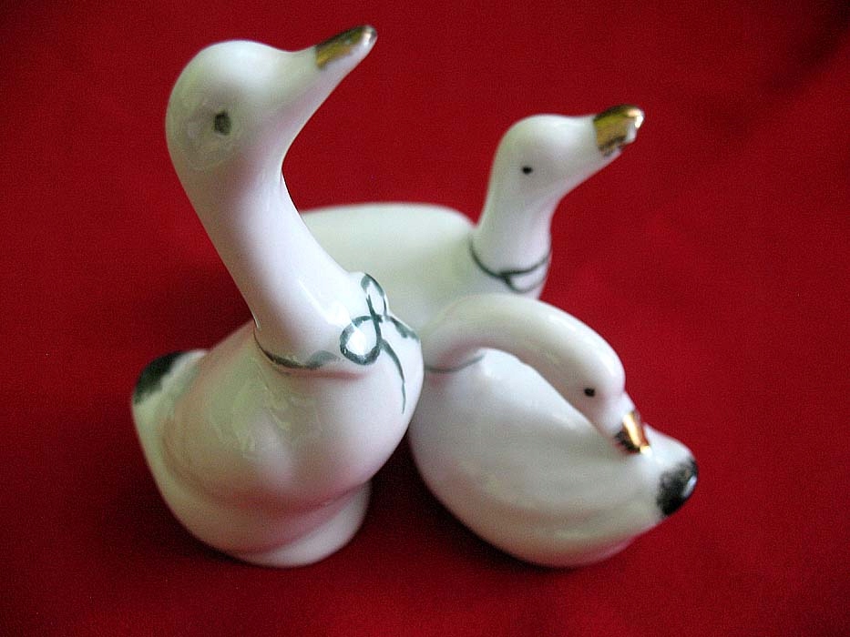 Polecam uroczą rodzinę malutkich gąsek. Wykonane z porcelany, ze złotymi dzióbkami. Doskonale ozdobią półkę małej gęsiarki, jak i dorosłego miłośnika tych pięknych zwierząt. Jest używany, bez metki i podpisu. W stanie jak widać na zdjęciach, które robię sama w realu. Wysyłka z Polski lub Berlina.