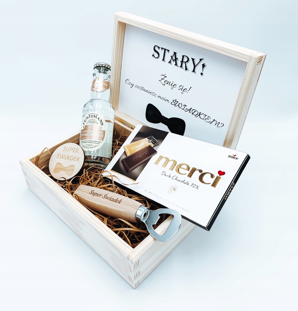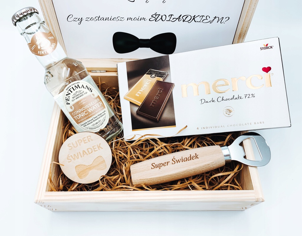 Drewniane pudełeczko w formie prośby o świadkowanie. Wewnątrz znajduje się etykieta z napisem widocznym na zdjęciu. Przedstawiony GiftBox to wyjątkowy i oryginalny prezent, który na pewno zachwyci każdego świadka.