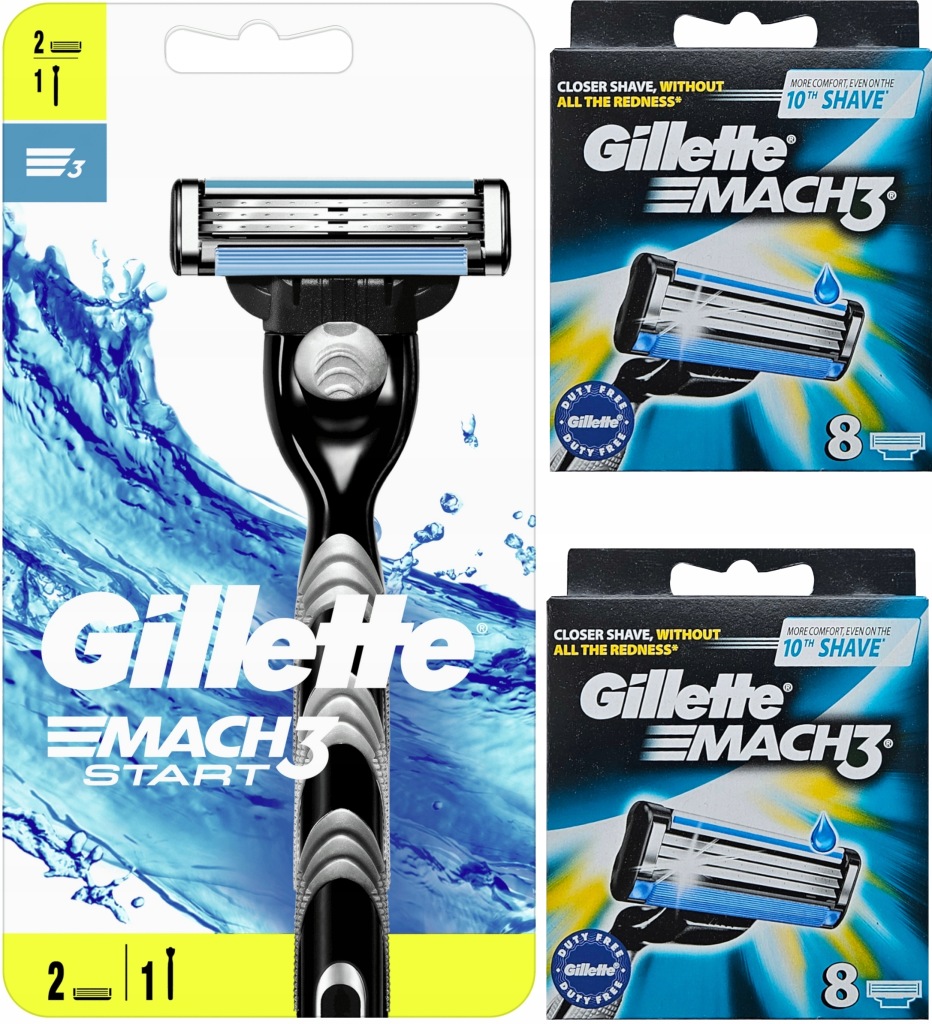 Maszynka do golenia dla mężczyzn Gillette Mach3 Start zapewnia dokładne golenie bez zaczerwienienia oraz uczucie lepszego golenia po 10 użyciach niż przy pierwszym goleniu nową maszynką jednorazową (w porównaniu z maszynką jednorazową Gillette BlueII Plus). Maszynka do golenia Mach3 Start wyposażona jest w rączkę Aqua-Grip zapewniającą całkowitą kontrolę podczas golenia, nawet gdy maszynka jest mokra, a także ostrza DuraComfort dla długotrwałego komfortu golenia, pasek żelowy pomagający chronić Twoją skórę przed zaczerwienieniem oraz ruchomą główkę dostosowującą siłę nacisku maszynki, aby umożliwić Ci łatwiejsze golenie (w porównaniu z maszynką jednorazową Gillette BlueII Plus).
