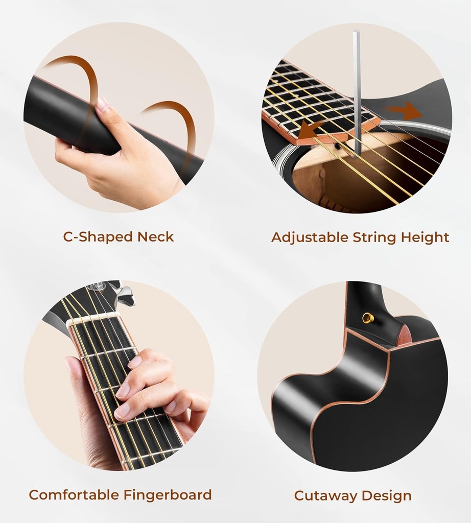 Stalowe struny zapewniają nowoczesne, jasne i dynamiczne brzmienie, odpowiednie dla początkujących i średniozaawansowanych gitarzystów.