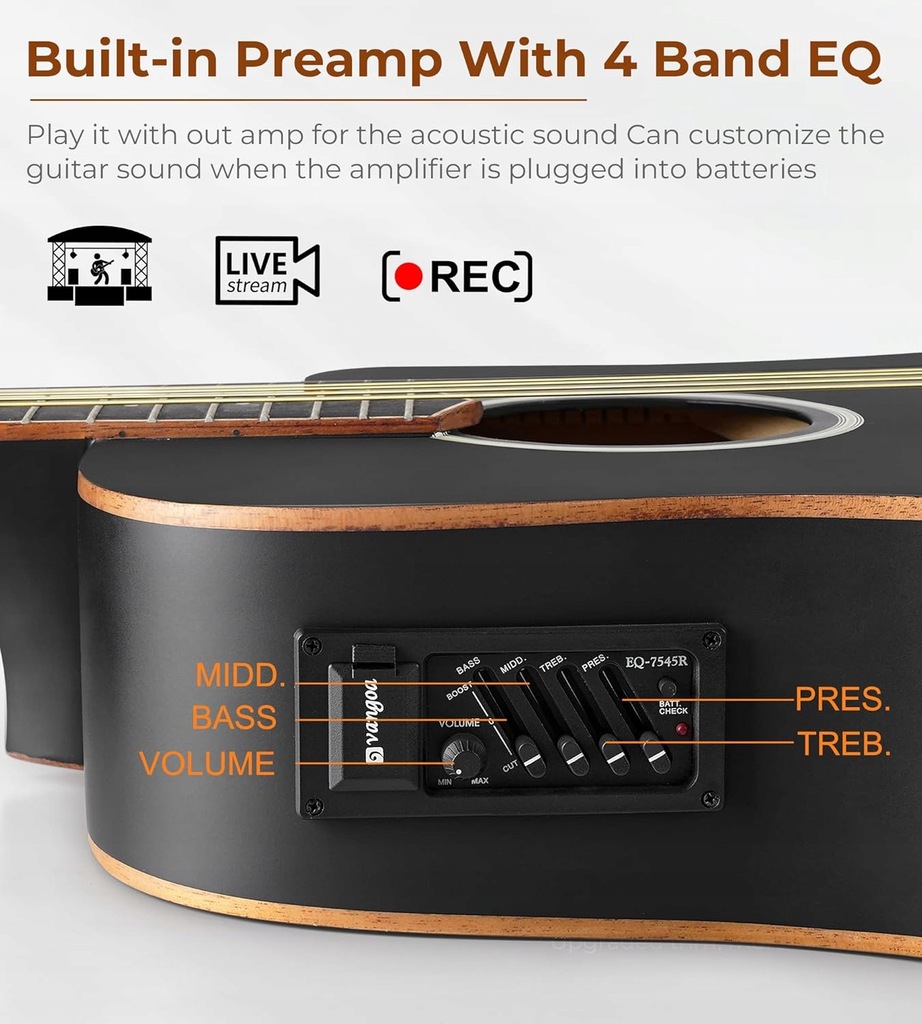 4‑pasmowy korektor (bass, middle, treble, presence) i wbudowany pickup umożliwiają podłączenie do wzmacniacza lub systemu nagłośnienia – idealna zarówno do ćwiczeń, jak i występów na żywo.