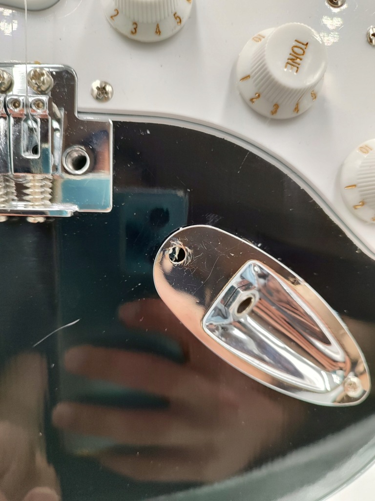 Gitara posiada wyrwaną śrubkę razem z kawałkiem drewna trzymającą port na wzmacniacz, da się podłączyć kabel.