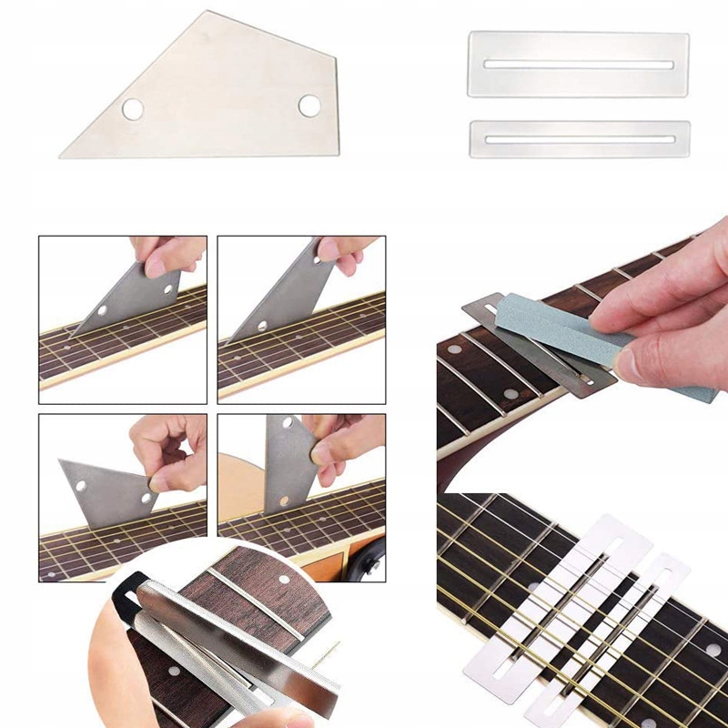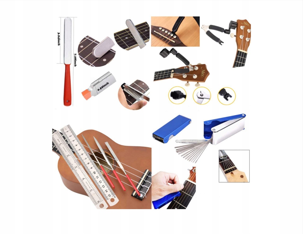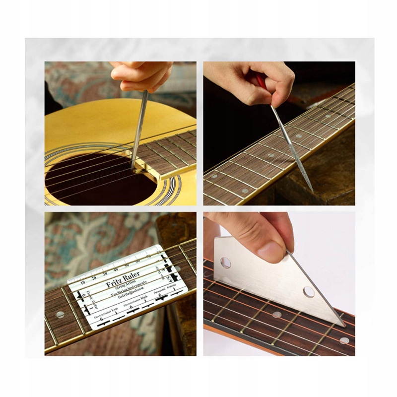 Zestaw narzędzi gitarowych zawiera: 3* Plik ,3 *Klucz sześciokrotny ,1* Śrubokręt, 1 *linijkę stalową, 1 *linijkę działania strun, 1 *3 w1 Wyciągacz końcówki strun gitarowych, 1 *zestaw narzędzi do szlifowania rowków mostków nakrętkowych, 2 *osłona klapki pod klapką, 1* plik koronowania progów gitarowych, 9 *mierniki promieniowania ze stali nierdzewnej (7.25" 9.5" 10" 12" 14" 15" 16" 20"), 1 *torba przechowywania.