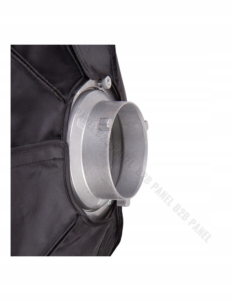 - Aluminiowy pierścień mocujący w standardzie mocowania Bowens, z możliwością obracania zamocowanego sofboxu o 360 stopni, śruba dociskowa umieszczona jest na zewnętrznej części softboxu