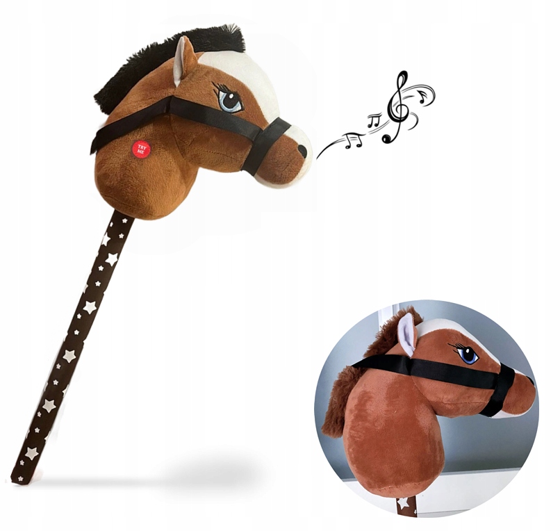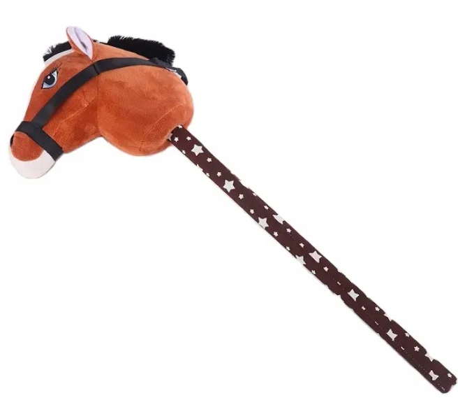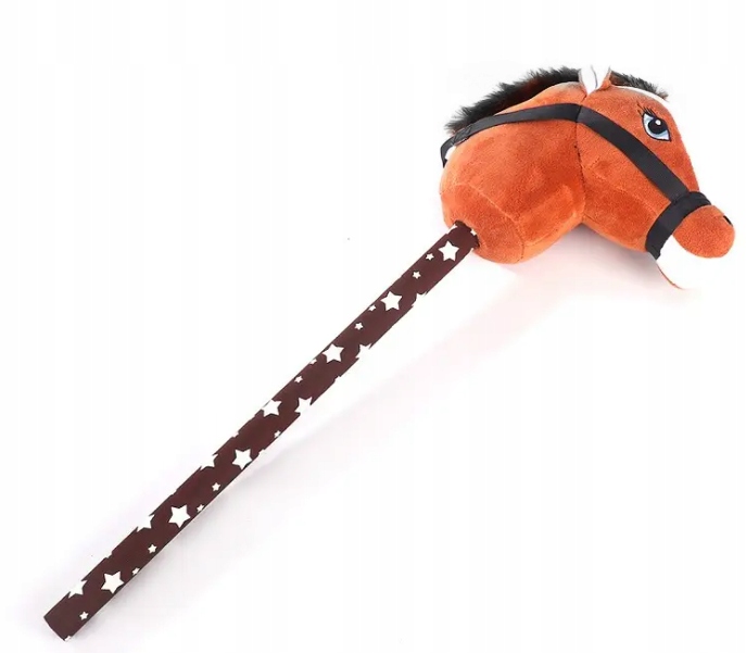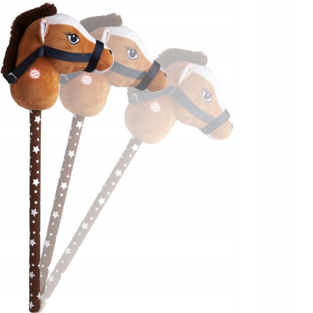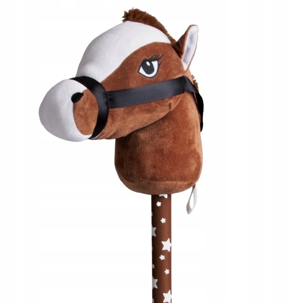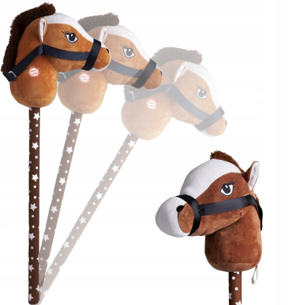 Idealna do zabaw na świeżym powietrzu, skoków przez przeszkody. Dziecko podczas zabawy naśladuje jazdę na prawdziwym koniku. Konik ma grzywę, ładne oczka, maści gniadej czyli brązowej. Koń ma założoną uzdę zapinaną na rzep którą dziecko może chwytać. Kij w białe gwiazdki. Po naciśnięciu na guzik konik wydaje odgłosy tupotu kopytek oraz rżenia i parskania. Konik mięciutki wykonany z pluszowego materiału.