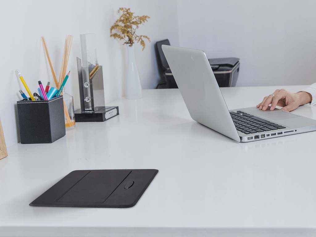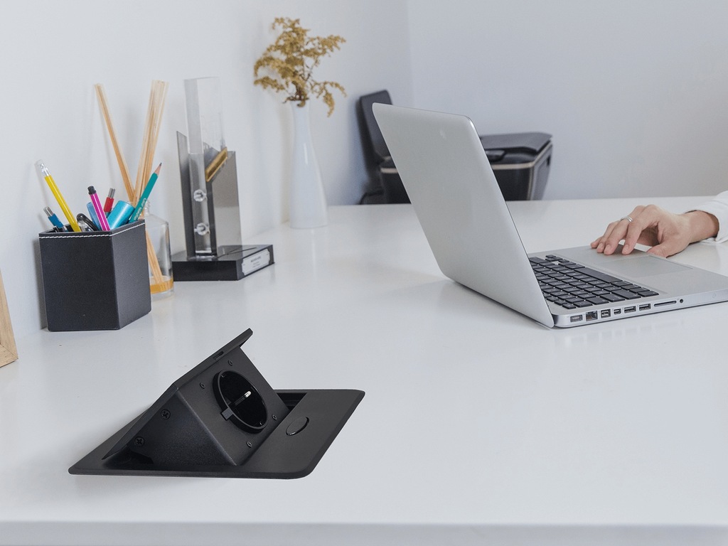 - innowacyjny mechanizm wysuwania i chowania w tym gnieździe pozwala na jego łatwe ukrycie, gdy nie jest używane. To rozwiązanie zapewnia nie tylko estetyczny wygląd, ale także pomaga w utrzymaniu porządku na biurku