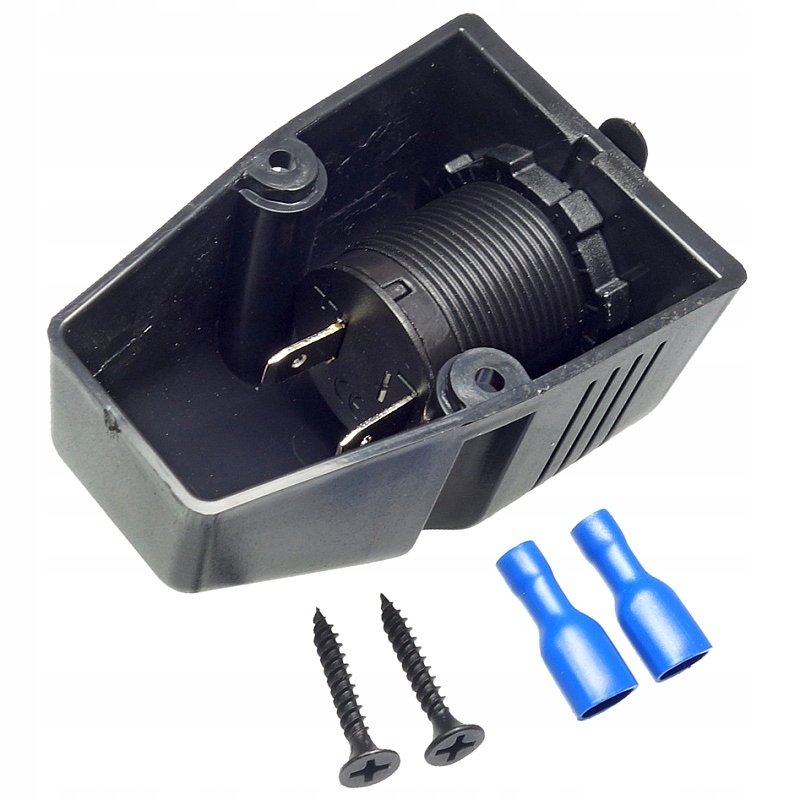 Obudowa do montażu napowierzchniowego z wbudowanym gniazdem zapalniczki samochodowej 12V, wyposażonym w osłonę bryzgoszczelną. Podłączenie zasilania do wyprowadzeń przy pomocy dołączonych do kpl. izolowanych konektorów F6.3mm. Polaryzacja zasilania opisana na obudowie przy wyprowadzeniach.