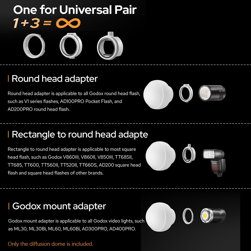 W zestawie przejściówka do montażu Godox, przejściówka z okrągłą głowicą i przejściówka z prostokąta na okrągłą, szeroko kompatybilna z większością lamp wideo i lamp błyskowych.