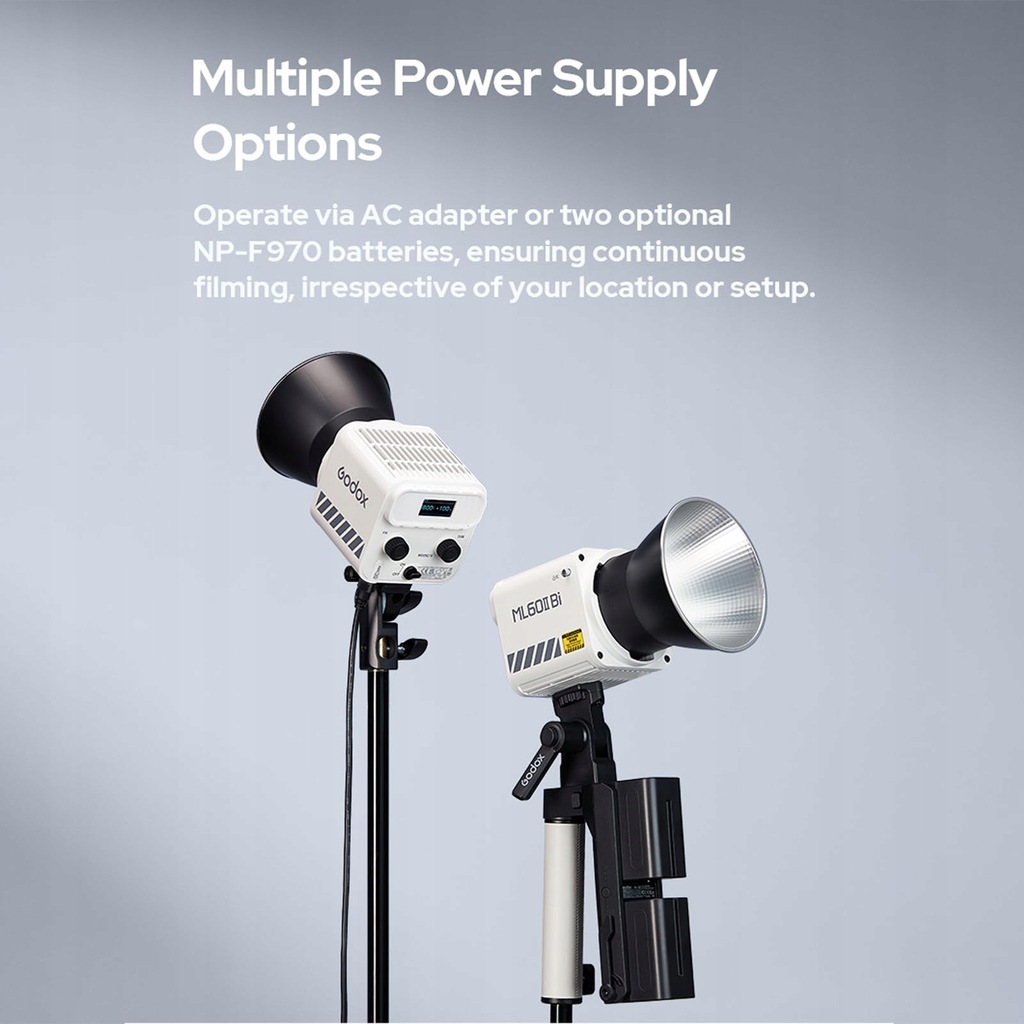 GODOX ML60IIBi Kit 70 W COB LED zestaw oświetlenia LED, światło dwukolorowe, 2800 K–6500 K, CRI ≥ 96, 11 efektów świetlnych FX, uchwyt GODOX obsługuje połączenie BT z uchwytem baterii, reflektorem i