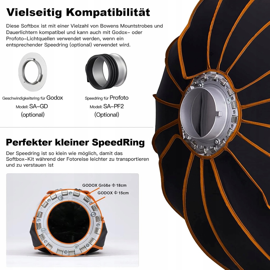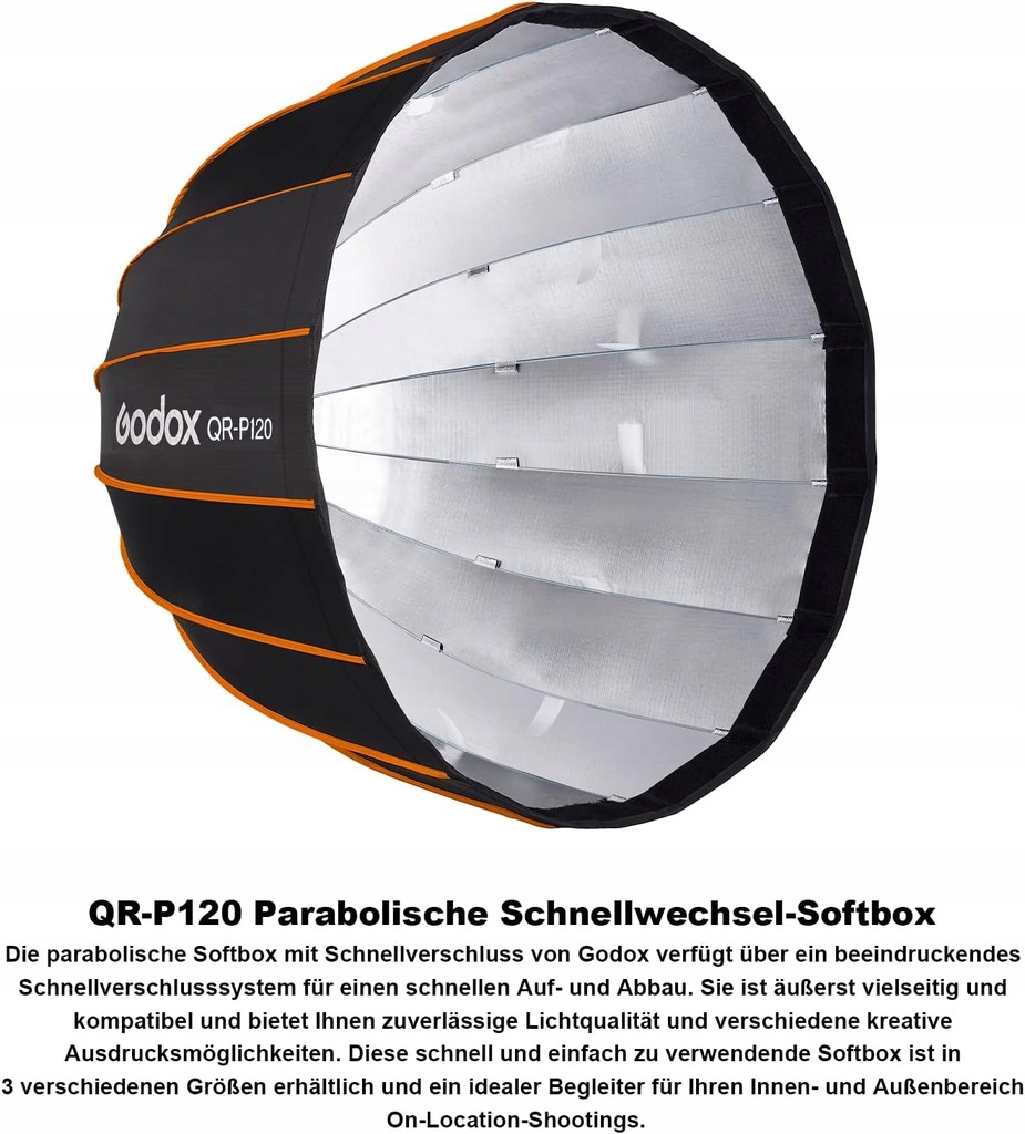 Seria softbox Goodox QR o dużej wszechstronności Paraboliczne miękkie pudełko GODOX zapewnia unikalne i wielokątne źródło światła; Tak więc tworzy delikatny efekt oświetlenia, który jest potrzebny w dużych obszarach. Duża głębokość, zmiany światła bardziej równomiernie, jasna jakość. Box jest kompatybilny z Speedbox lite z Bowens Mo
