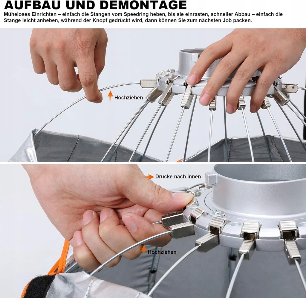 Szybka konfiguracja - seria GODOX QR-P120 paraboliczne miękkie pudełko jest zaprojektowane jak parasol; łatwe w obsłudze, bez problemów podczas otwierania lub zamykania. Posiada imponujący system szybkiego zamykania zapewniający szybki montaż i demontaż, dzięki któremu można otworzyć lub zamknąć miękką skrzynkę w ciągu kilku sekund