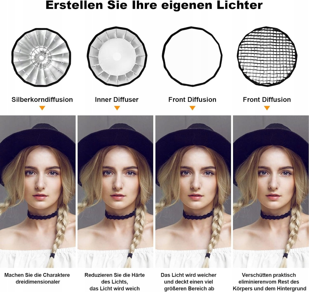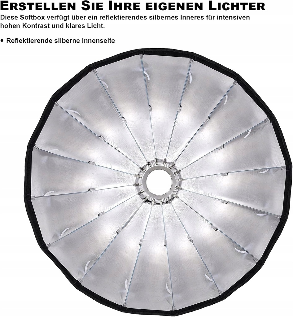 Doskonała konstrukcja Hexadecagon Deep Parabolic Box - GODOX QR-P120/GODOXQR-P90 W porównaniu do tradycyjnego softboxa, wzornictwa ramy parasola, zarówno 16 metalowych drążków, jak i korpus są połączone ze sobą dzięki pierścieniowi szybkiego zamykania można otworzyć lub zamknąć Softbox w ciągu kilku sekund. Działa jako bardzo duży reflektor, dobrze do koncentracji światła i osiągnięcia miękkie i wysokie nasyconymi efektami świetlnymi.