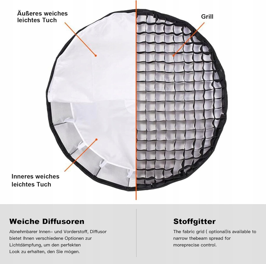 Profesjonalna ściereczka odblaskowa – idealny miękki efekt świetlny: softbox marki GODOX z serii QR posiada odblaskowe srebrne wnętrze, aby uzyskać imponujący, wysoki kontrast i chrupiące światło. Upewnij się, że światło jest cross-reflecte dinternally to osiągnięcie efektu świetlnego. Grill Honeycomb skutecznie restricts the light range and achieves moreprecise light control