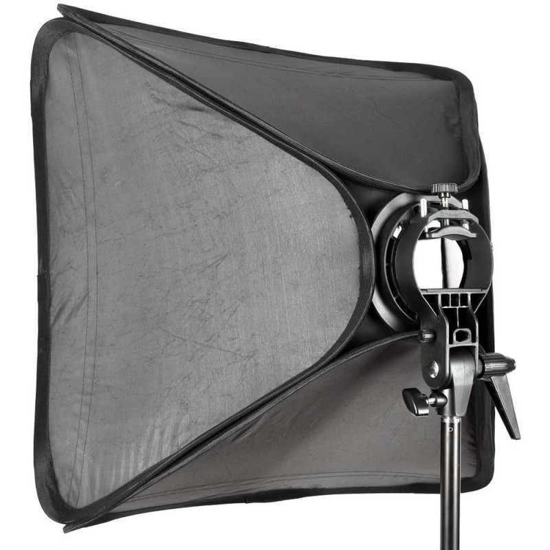 S-type bracket (uchwyt montażowy) + softbox ma zwartą konstrukcję i nie wymaga skomplikowanego montażu, dzięki czemu jest zawsze gotowy do pracy. W celu regulacji kierunku światła uchwyt można obracać, a także przechylać o 90 ° do przodu i do tyłu. Na dole można znaleźć otwór do zainstalowania opcjonalnego parasola lub innego akcesorium. W zestawie z produktem znajduje się składany softbox 80x80cm zapewniający miękkie i równomierne oświetlenie oraz torba do przenoszenia ułatwiająca transport.