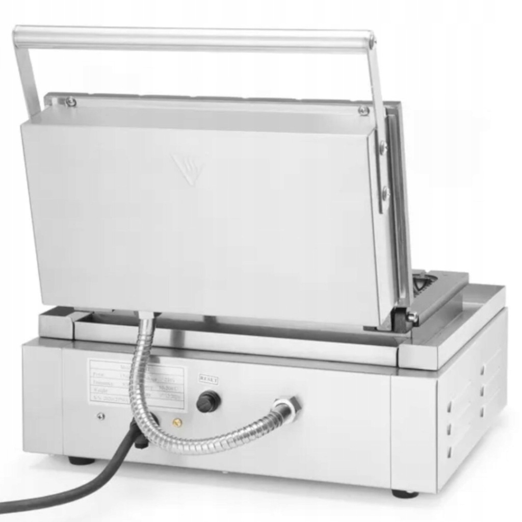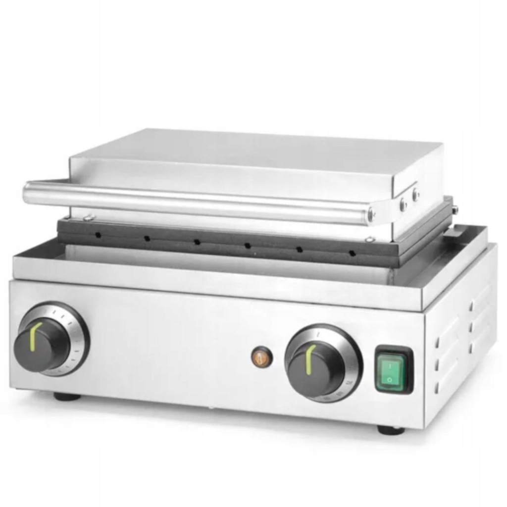 Gofrownica Corn-dog marki Hendi to idealna propozycja dla wszelkiego typu lokali gastronomicznych chcących poszerzyć swoją ofertę o atrakcyjne gofry na patyku. Obudowa wykonana została ze stali nierdzewnej 18/0, co gwarantuje długoletnie użytkowanie i łatwe czyszczenie. Otwory wentylacyjne w obudowie chronią elementy sterujące przed przegrzaniem. Rączka nie nagrzewa się. Płyta grzewcza wykonana została z odlewanego aluminium i pokryta trwałą powłoką z domieszką tytanu, co zapobiega przywieraniu. Możliwość pieczenia jednocześnie 6 gofrów lub corn-dogów. Płyta posiada specjalne żłobienia na patyczki. Rynienka ociekowa na nadmiar ciasta ułatwia utrzymanie czystości stanowiska pracy. Regulacja temperatury następuje bezstopniowo za pomocą termostatu w zakresie od 50˚C do 220˚C. Czasomierz ma zakres do 15 min