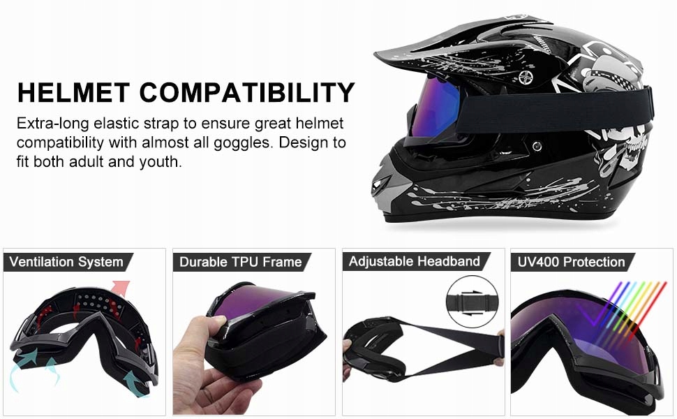 Regulowany pasek z podwójną klamrą: zarówno maksymalny rozmiar, jak i minimalny rozmiar są większe niż pasek z pojedynczą klamrą. Te gogle motocyklowe pasują do większej liczby osób.