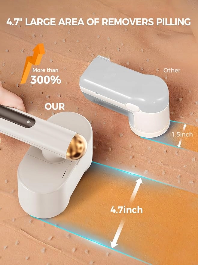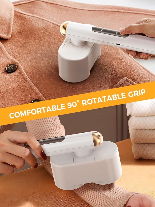 - Wygodna 90° obrotowa rączka: obrotowa rączka zmniejsza obciążenie i zmęczenie dłoni oraz ułatwia przesuwanie maszynki po tekstyliach. Wygodna rączka jest odpowiednia zarówno dla osób leworęcznych, jak i praworęcznych. 90° obrotowa rączka zapewnia 12 cm szerokości powierzchni styku, co umożliwia skuteczne usuwanie kłaczków i jest łatwa w obsłudze zarówno w przypadku dużych mebli, jak i małych ładunków.