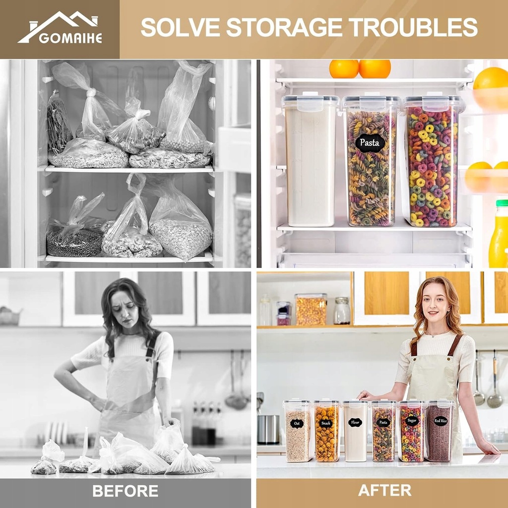 ✅Większy porządek: Dzięki przezroczystym, hermetycznym pojemnikom produkty spożywcze są uporządkowane, co eliminuje bałagan związany z przechowywaniem w plastikowych woreczkach.