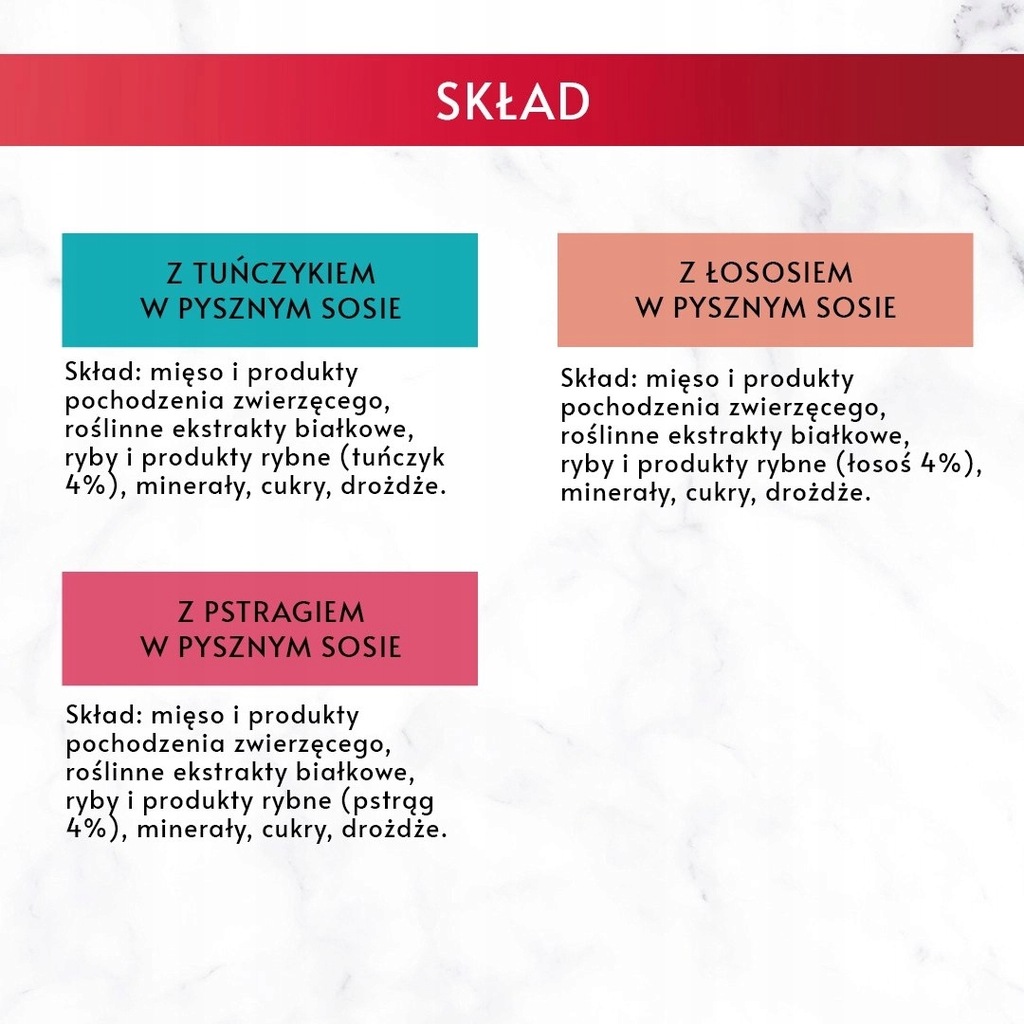 Opakowanie zawiera drobno posiekane w smakowitym sosie kawałki tuńczyka x2, łososia x2, pstrąga x2.