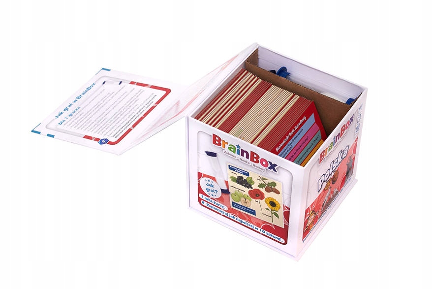 Jak Polska długa i szeroka, pełna jest fascynujących regionów, postaci i miejsc. Dzięki BrainBox - Polska możesz poznać je lepiej, ćwicząc przy okazji zapamiętywanie i poszerzając swoją wiedzę! Czym jest BrainBox? To seria wyjątkowych gier edukacyjnych, które będą wspierały rozwój Twoich dzieci lub podopiecznych na każdym etapie nauki. Wykorzystując dynamiczną i angażującą zabawę, gry z linii BrainBox pozwalają rozwijać wiedzę, a także wspierają trening pamięci i spostrzegawczości, czyli umiejętności kluczowych dla rozwoju. Każde pudełko to zestaw kart, które po jednej stronie mają obrazek (należy przyjrzeć mu się przez określony czas), a z drugiej zestaw pytań, sprawdzających nie tylko naszą pamięć, ale też wiedzę z zakresu danego przedmiotu. Na czym to polega? Weź kartę z pudełka i odwróć klepsydrę. Przyglądaj się obrazkowi na karcie tak długo, jak przesypuje się piasek. Możesz przekręcić klepsydrę jeszcze raz, jeśli potrzebujesz więcej czasu. Przekaż kartę innemu graczowi i rzuć kością. Liczba na kości wskazuje, na które pytanie musisz odpowiedzieć (na przykład gdy wyrzucisz 2, odpowiadasz na pytanie numer 2). Gracz, któremu została przekazana karta, czyta na głos pytanie, na które musisz udzielić odpowiedzi. Następnie sprawdza Twoją odpowiedź, patrząc na obrazek na drugiej stronie karty. Jeśli odpowiedź jest prawidłowa, zatrzymaj kartę. Jeśli jest błędna, odłóż kartę do pudełka. Teraz kolej na następnego gracza. Gracz, który zgromadzi najwięcej kart po upływie 10 minut, wygrywa! Dlaczego pokochasz tę grę? To połączenie doskonałej, dynamicznej zabawy z realnym rozwijaniem wiedzy z konkretnych dziedzin. Testy wykazały, że gry z serii BrainBox stanowią doskonałe rozszerzenie nauki przedszkolnej i szkolnej; nadają się do wykorzystania zarówno w szkole, jak i w domu. BrainBoxy są dostosowane do wspólnej zabawy dzieci i dorosłych, by była ona satysfakcjonująca dla obu stron. Gry powstają w etycznych warunkach, z materiałów pochodzących z recyklingu i zdatnych do ponownego przetworzenia.