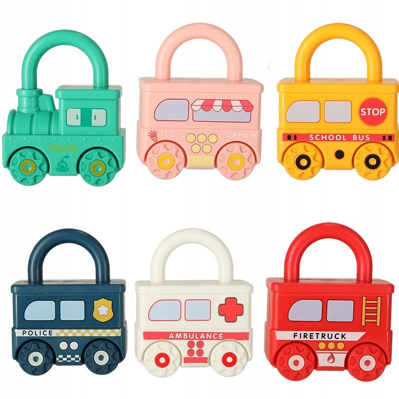 Aż sześć uroczych samochodziko-kłódek: lokomotywa, autobus szkolny, radiowóz, straż pożarna, karetka i lodziarnia, które zapewniają wiele możliwości zabawy!