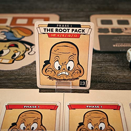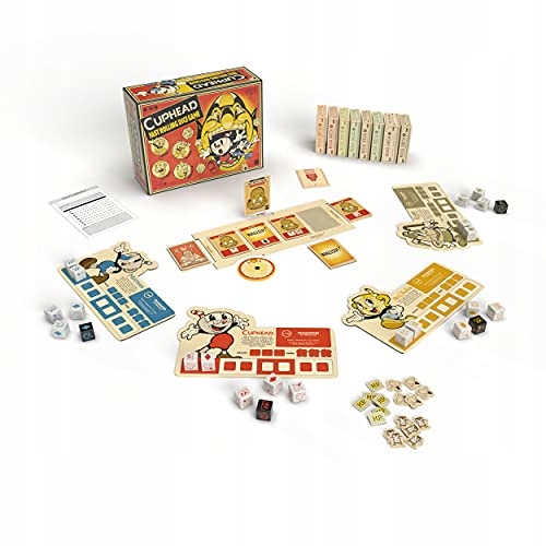 Product Description From the popular Cuphead video game, comes an all new fast action, original cooperative dice game where players must roll dice to defeat iconic bosses. Featuring the classic hand-drawn 1930’s art style, this card and dice game emulates the side-scrolling, run-and-gun excitement from the video game. Work together to be quick and nimble to avoid the attacks and defeat the bosses to win. Includes custom art, 8 Boss Decks, custom dice and more! Box Contains 4 Player Boards 1 Center Board 1 Boss Health Tracker 24 Six-Sided Dice 20 Wallop Cards 16 Health Tokens 12 Parry Tokens 40 Coins 5 Time Tokens 8 Boss Decks (25-40 cards each) 1 Results Tracker 1 Pad of Save Sheets