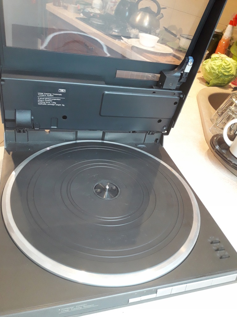 Silnik pracuje prawidłowo bezszelestnie bez luzów na osi , ramię prawidłowo przesuwa się w lewo i prawo, opuszcza i podnosi ,wkładka z igłą jest kompletna, pokrywa z drobnymi rysami ( do spolerowania )