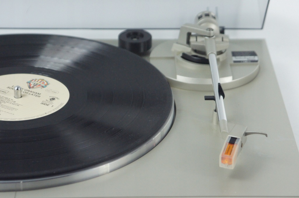 Gramofon w zestawie z wkładką i igłą, pokrywą, poddany kalibracji (ustawienie docisku igły, odpowiednie ustawienie wkładki w koszyku, ustawienie antyskatingu), gotowy do podłączenia i odtwarzania płyt.