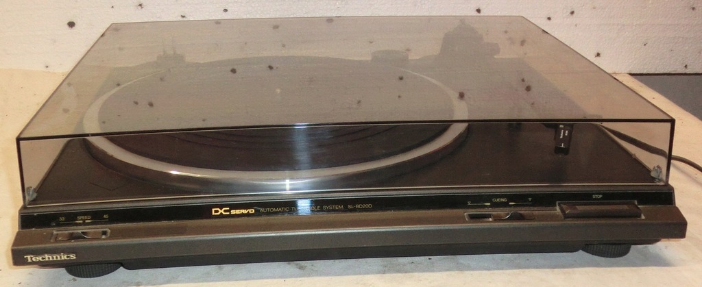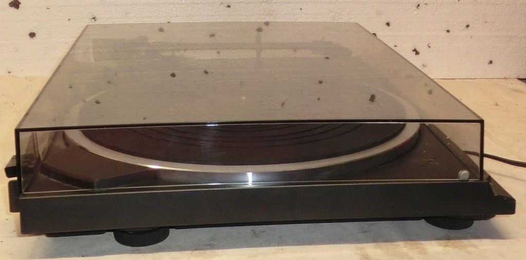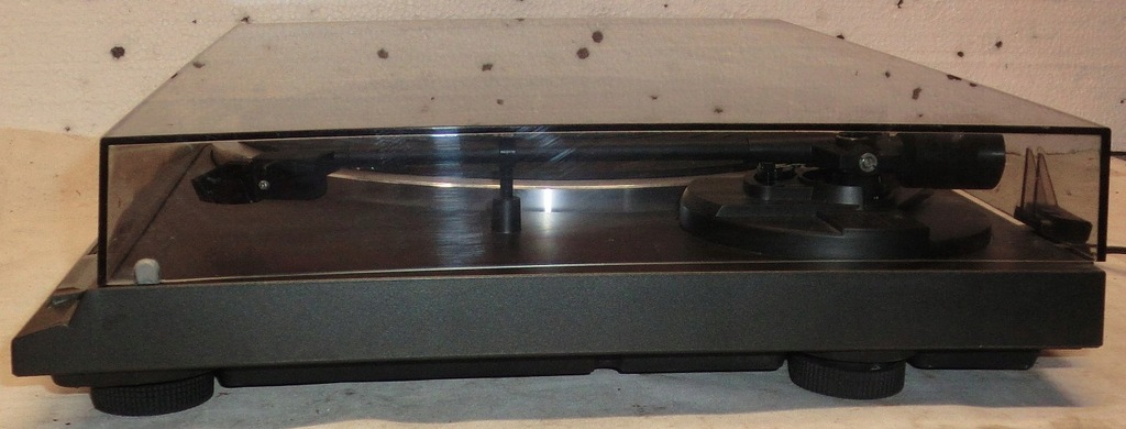 Gramofon włącza się, lecz ramie nie opuszcza się, zmiana obrotów działa, reaguje na przycisk STOP- nic więcej nie było sprawdzane. Stan jak na zdjęciach, ślady używania.