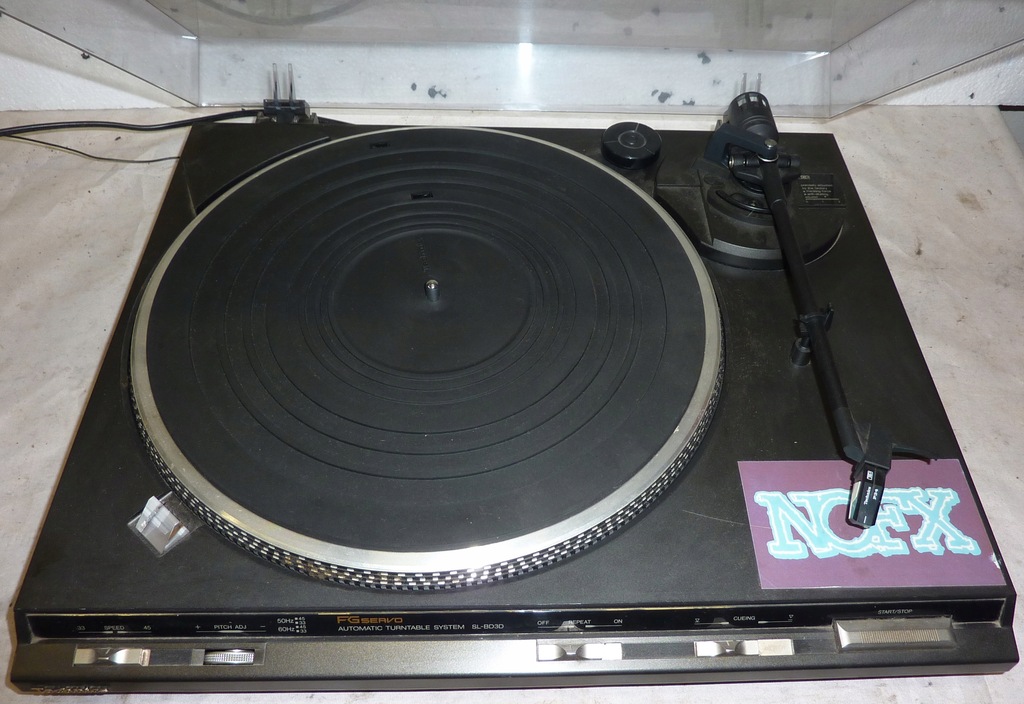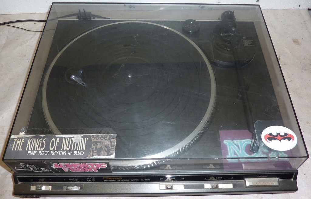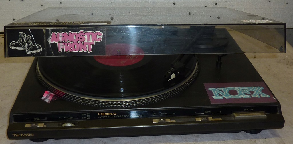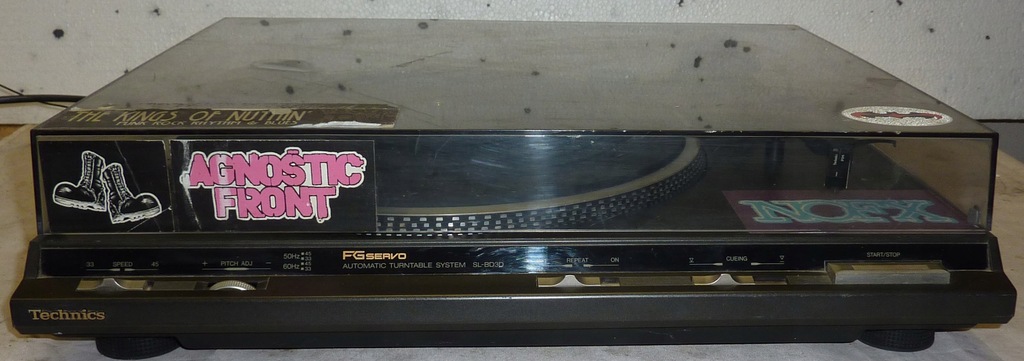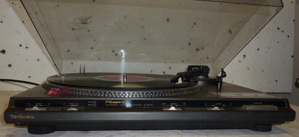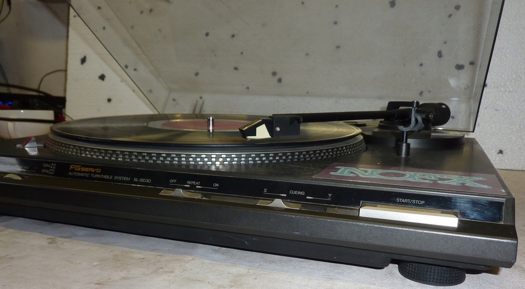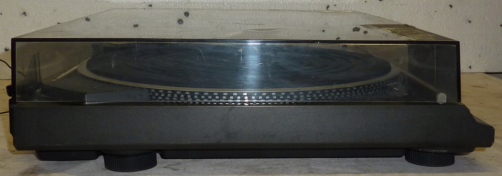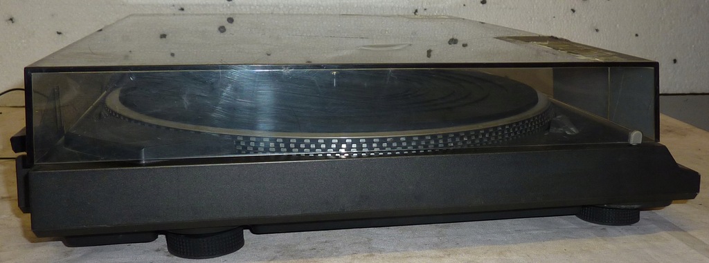 Gramofon włącza się, prawidłowo odtwarza/zatrzymuje się, prędkości działają- nic więcej nie było sprawdzane. Górna klapa po jakimś czasie sama opada do pewnej pozycji(foto). Stan jak na zdjęciach, ślady używania.