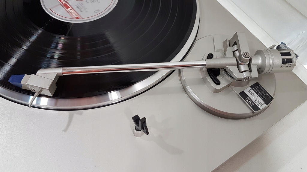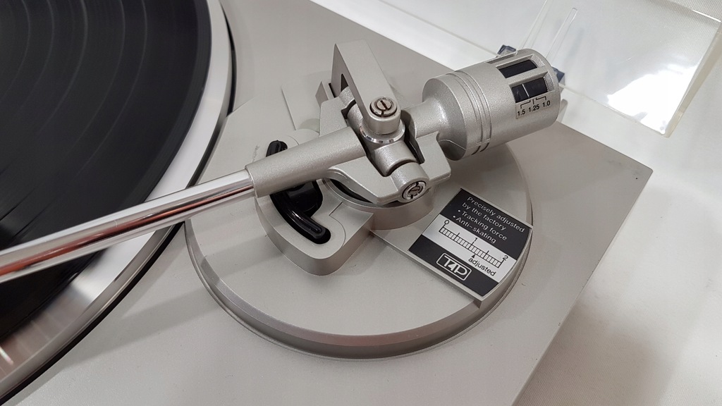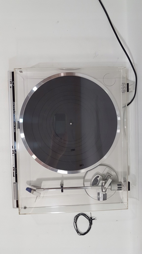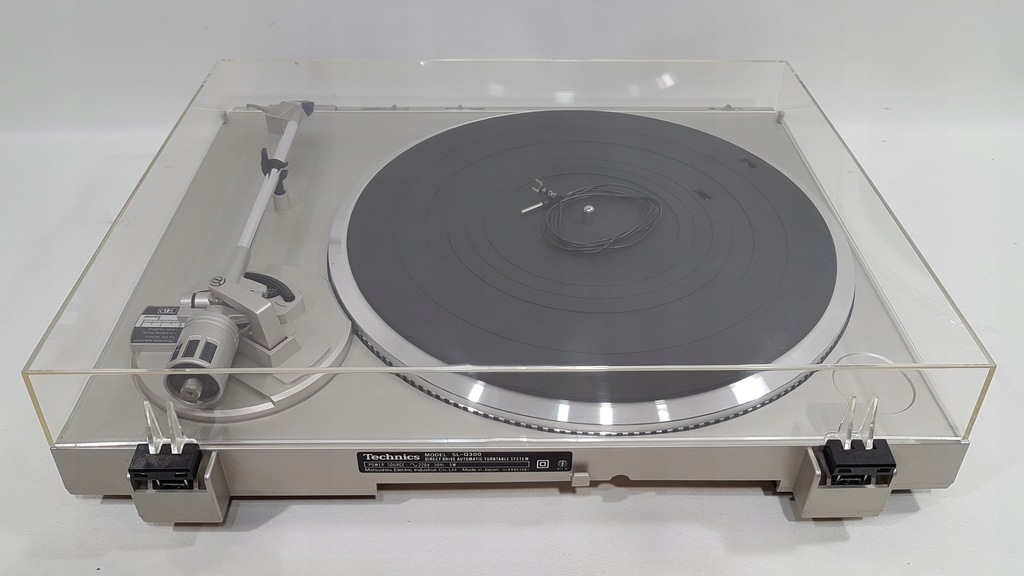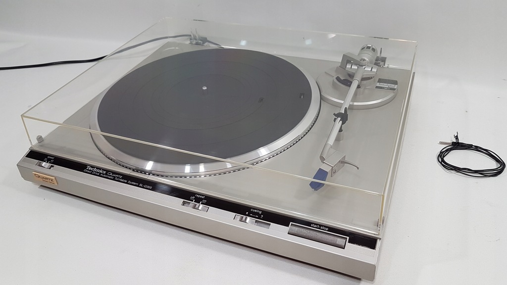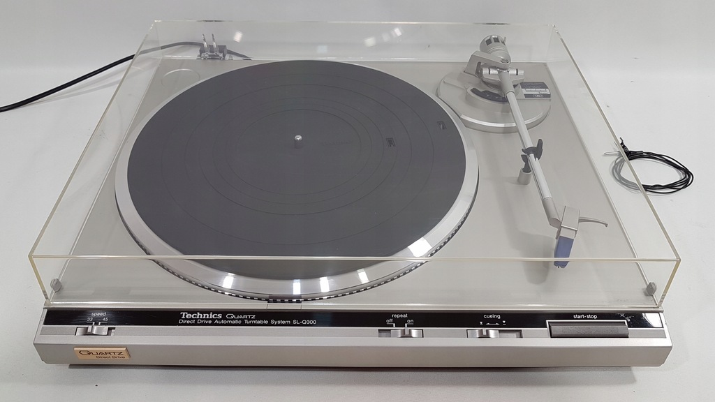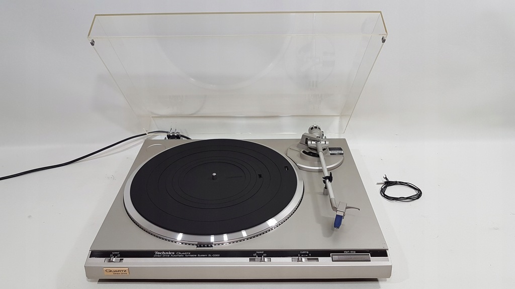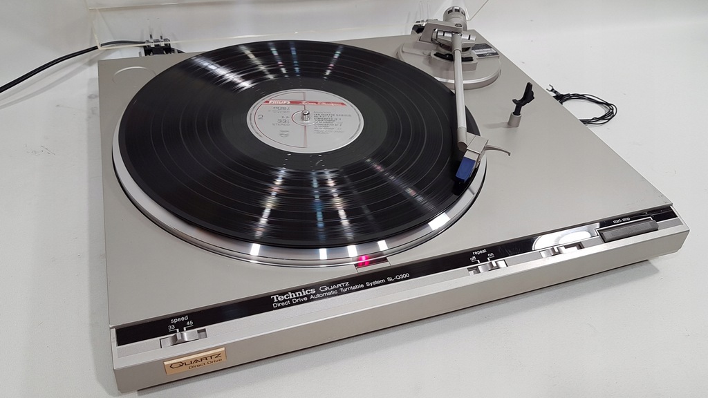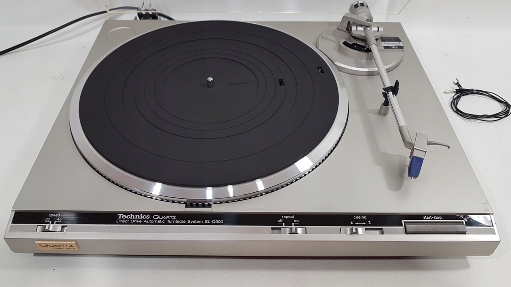 Zapraszam do zakupu gramofonu marki TECHNICS model SL-Q300. Gramofon z bardzo popularnej serii, jeden z topowych modeli o napędzie bezpośrednim z kwarcowa stabilizacją obrotów, w pełni automatyczny ( po wciśnięciu przycisku START/STOP ramie samoczynnie ustawia się na początek płyty i powraca na swoje miejsce po zakończeniu strony płyty lub po naciśnięciu przycisku START/STOP w dowolnym momencie ), aluminiowy solidny talerz wraz z tarczą stroboskopową , tradycyjne dwie prędkości 33 i 45, ANTYSCATING, funkcja REPEAT, lekkie ramię proste bardzo dobrze ułożyskowane. Automatyczne rozpoznawanie wielkości płyty lub jej brak na talerzu. Bez płyty gramofon nie odpali automatycznie. Zabezpiecza to igłę przed przypadkowym uruchomieniem gramofonu bez płyty. Technicznie kompletnie sprawny, oryginalna wkładka TECHNICS P30 z nową igłą . Przewód zasilający, uziemiający oraz sygnałowy w komplecie. Gramofon jest po pełnym przeglądzie - czyszczeniu, smarowaniu, regulacji i kalibracji i tylko taki zabieg gwarantuje długą bezawaryjną, prawidłową pracę urządzenia. Gramofon jest bardzo ładny, pokrywa po profesjonalnej polerce.