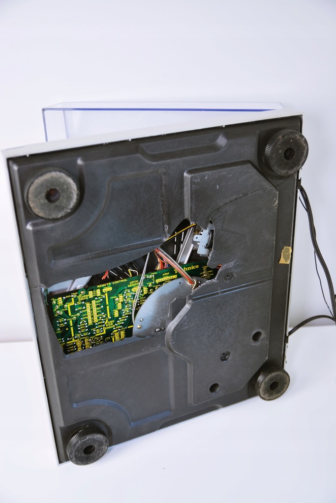 W gramofonie uszkodzona jest dolna obudowa lecz w żadnym przypadku nie przeszkadza to w funkcjonowaniu urządzenia, elektronika nie ruszona. Automatyka działa precyzyjnie. Obroty są stabilne nie falują. Górna pokrywa pęknięta. Zawiasy trzymają pokrywa nie opada.