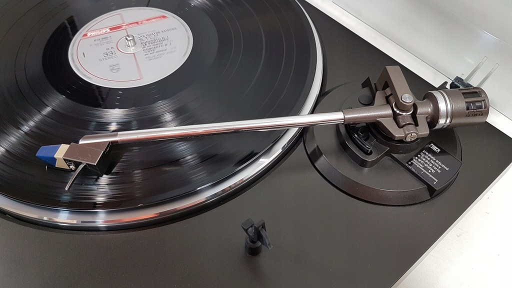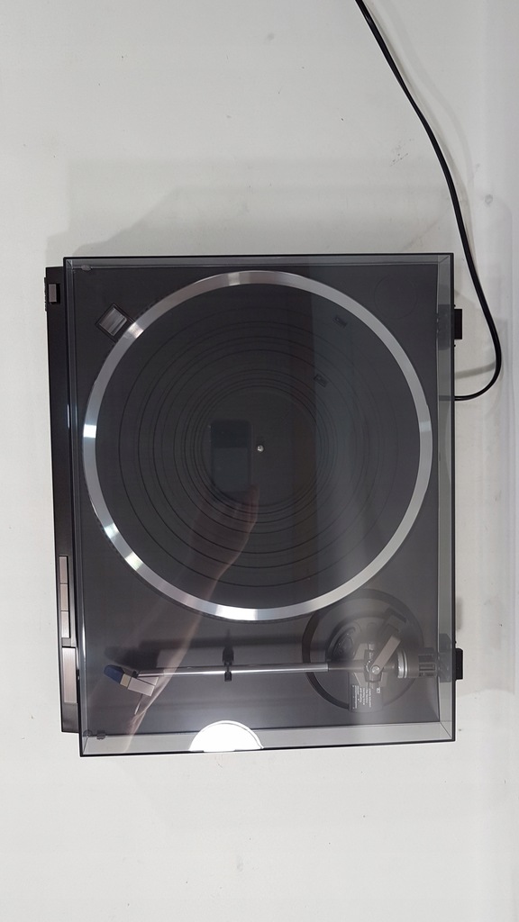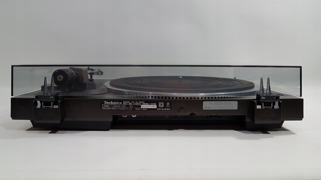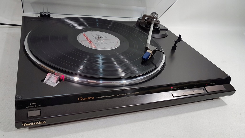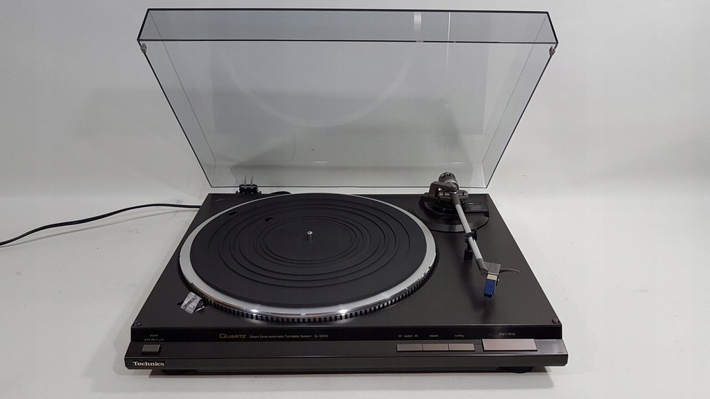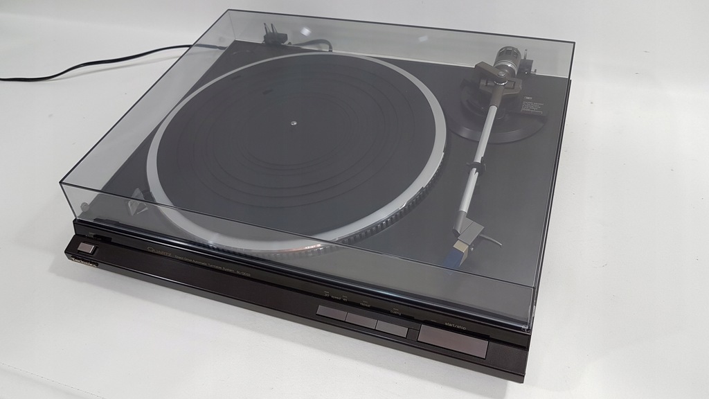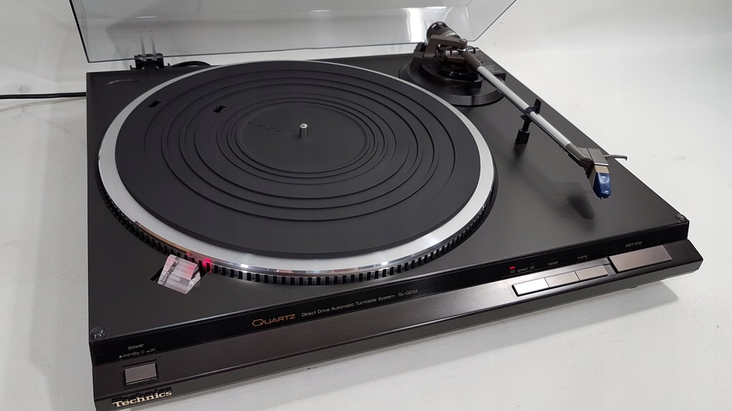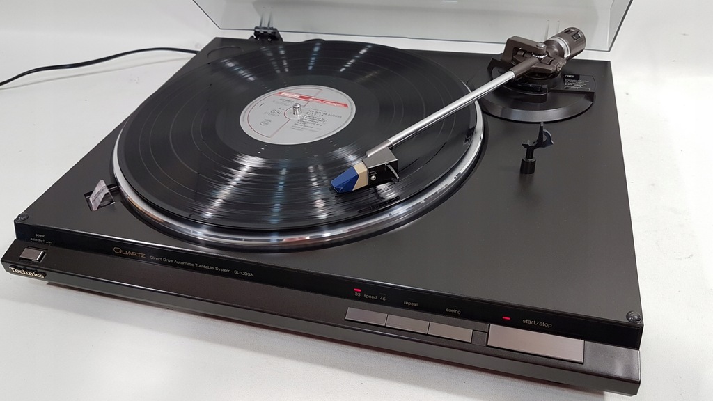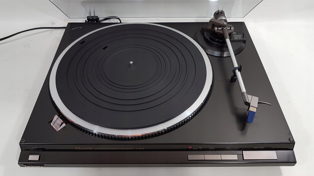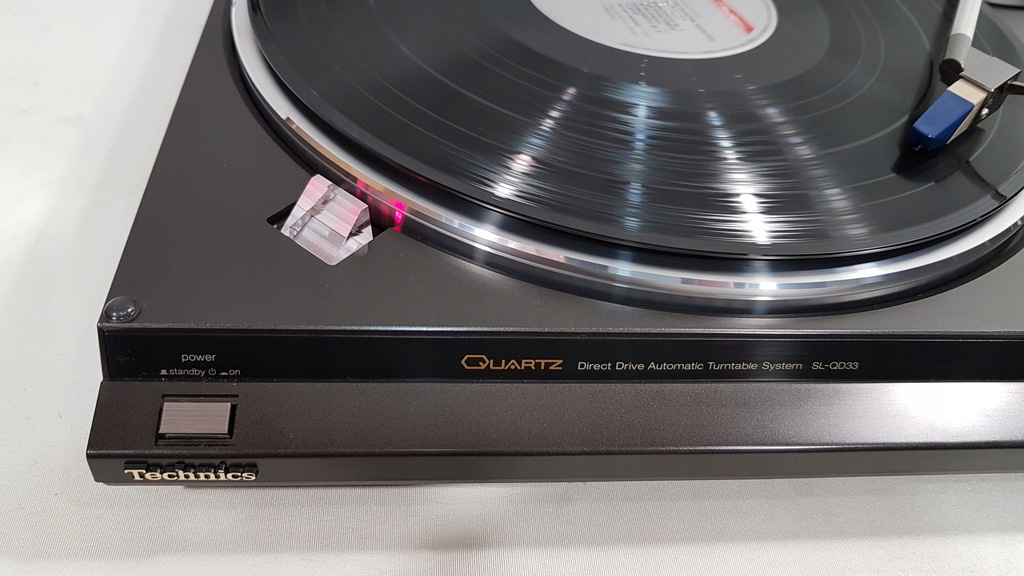 Zapraszam do zakupu gramofonu marki TECHNICS model SL-QD33. Gramofon z bardzo popularnej, ostatniej serii złotych lat TECHNICS'a, najwyższy model odróżniający się tym że posiada osobny napęd automatyki ramienia. Jest to gramofon o napędzie bezpośrednim z kwarcowa stabilizacją obrotów, w pełni automatyczny ( po wciśnięciu przycisku START/STOP ramie samoczynnie ustawia się na początek płyty i powraca na swoje miejsce po zakończeniu strony płyty lub po naciśnięciu przycisku START/STOP w dowolnym momencie ), aluminiowy solidny talerz wraz z tarczą stroboskopową , tradycyjne dwie prędkości 33 i 45, ANTYSCATING, funkcja REPEAT, lekkie ramię proste bardzo dobrze ułożyskowane. Automatyczne rozpoznawanie wielkości płyty lub jej brak na talerzu. Bez płyty gramofon nie odpali automatycznie. Zabezpiecza to igłę przed przypadkowym uruchomieniem gramofonu bez płyty. Technicznie kompletnie sprawny, oryginalna wkładka TECHNICS P30 z nową igłą . Przewód zasilający, uziemiający oraz sygnałowy w komplecie. Gramofon jest po pełnym przeglądzie - czyszczeniu, smarowaniu, regulacji i kalibracji i tylko taki zabieg gwarantuje długą bezawaryjną, prawidłową pracę urządzenia. Gramofon jest bardzo ładny, pokrywa po profesjonalnej polerce.