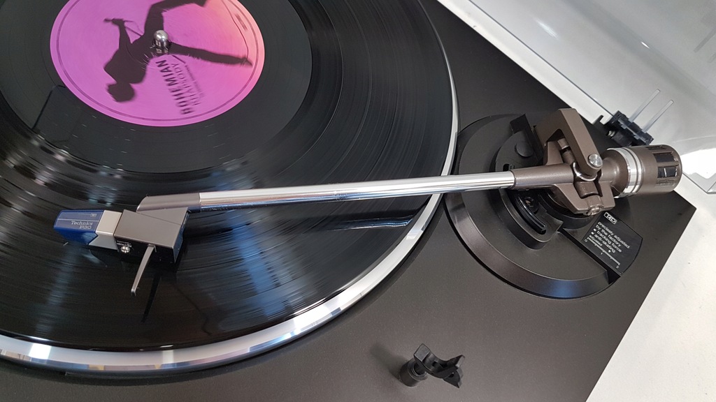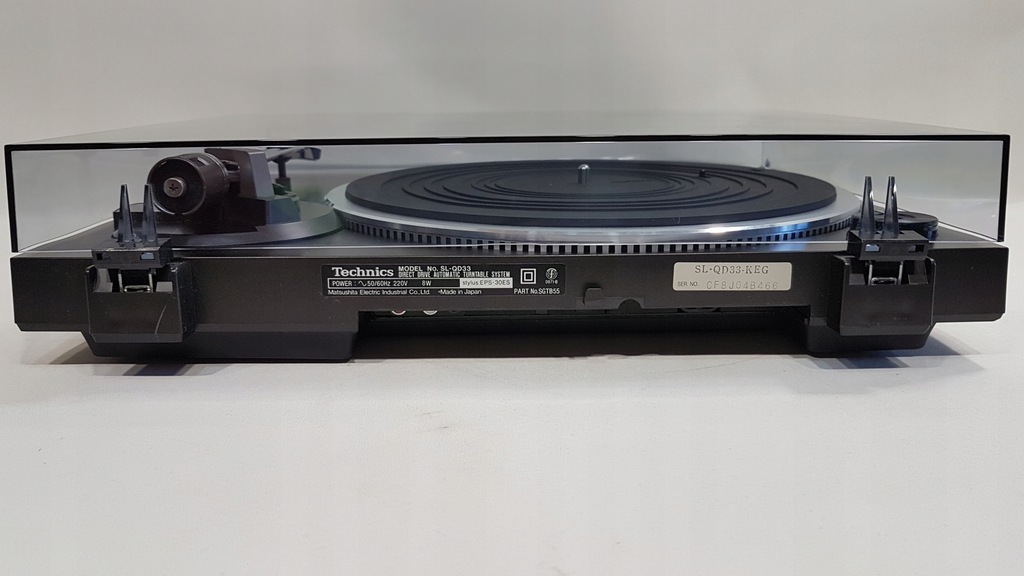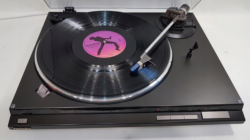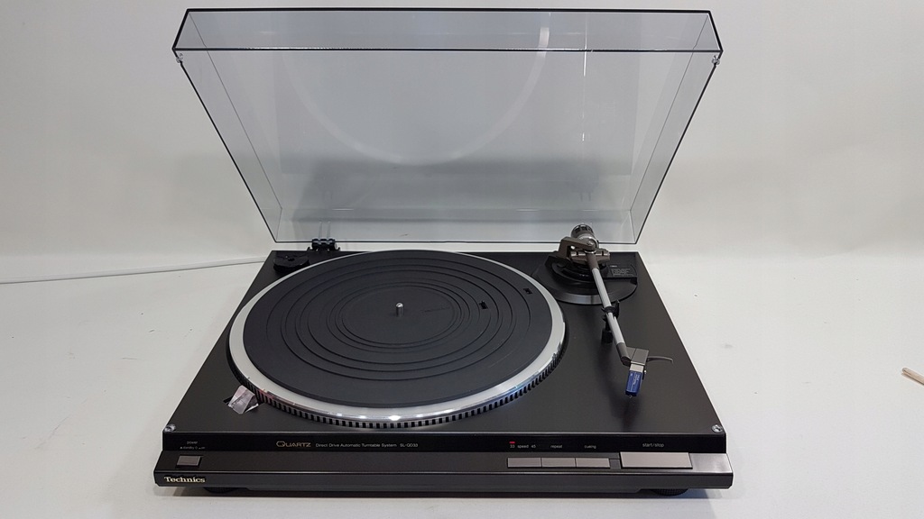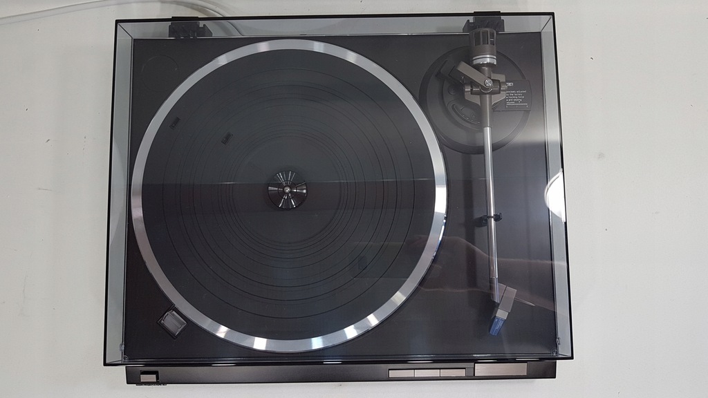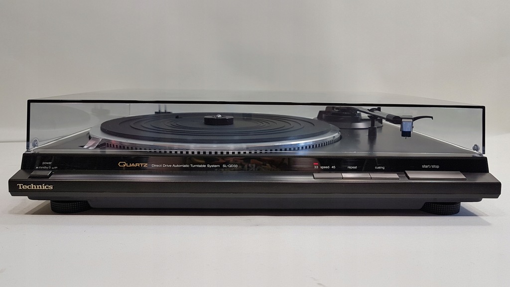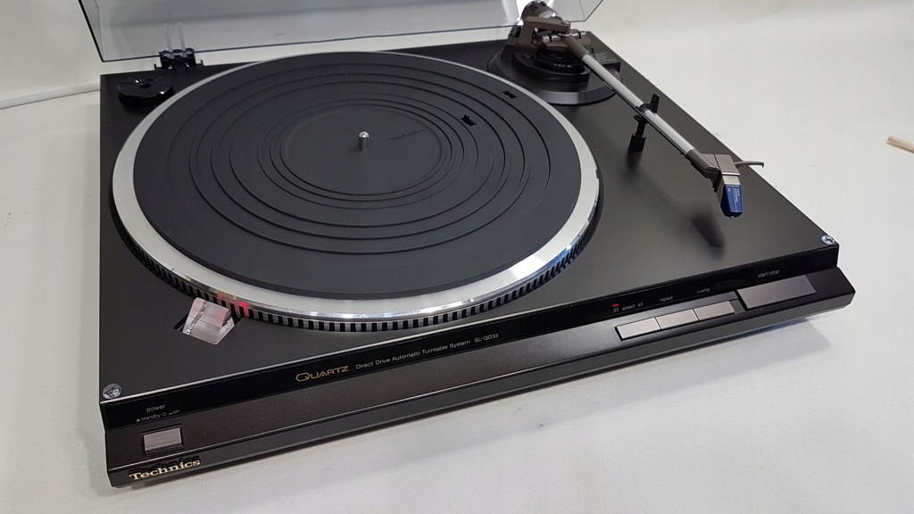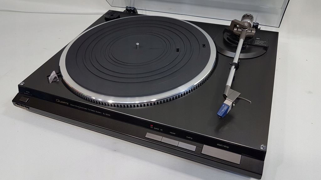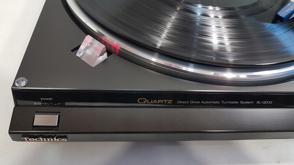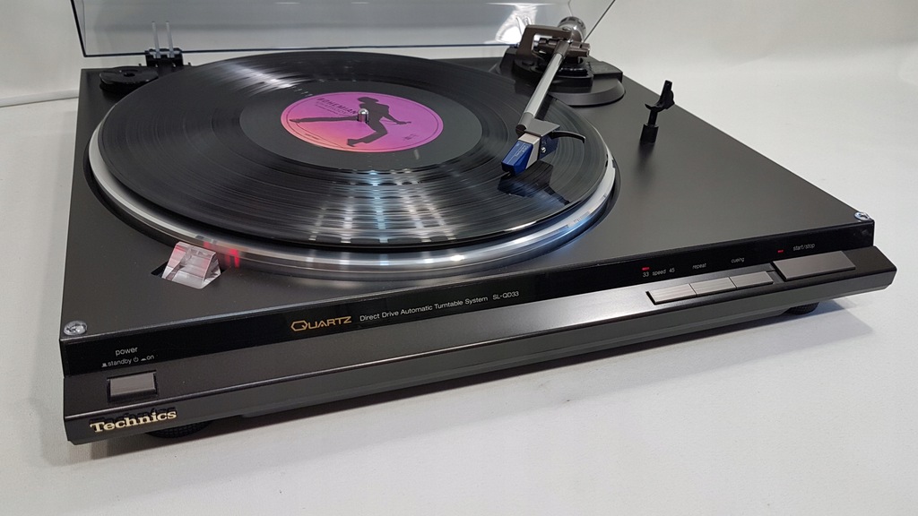 Zapraszam do zakupu gramofonu marki TECHNICS model SL-QD33. Gramofon z bardzo popularnej, ostatniej serii złotych lat TECHNICS'a, najwyższy model odróżniający się tym że posiada osobny napęd automatyki ramienia. Jest to gramofon o napędzie bezpośrednim z kwarcowa stabilizacją obrotów, w pełni automatyczny ( po wciśnięciu przycisku START/STOP ramie samoczynnie ustawia się na początek płyty i powraca na swoje miejsce po zakończeniu strony płyty lub po naciśnięciu przycisku START/STOP w dowolnym momencie ), aluminiowy solidny talerz wraz z tarczą stroboskopową , tradycyjne dwie prędkości 33 i 45, ANTYSCATING, funkcja REPEAT, lekkie ramię proste bardzo dobrze ułożyskowane. Automatyczne rozpoznawanie wielkości płyty lub jej brak na talerzu. Bez płyty gramofon nie odpali automatycznie. Zabezpiecza to igłę przed przypadkowym uruchomieniem gramofonu bez płyty. Technicznie kompletnie sprawny, oryginalna wkładka TECHNICS P30 z nową igłą. Wysokiej jakości przewód zasilający, uziemiający oraz sygnałowy w komplecie. Gramofon jest po pełnym przeglądzie - czyszczeniu, smarowaniu, regulacji i kalibracji i tylko taki zabieg gwarantuje długą bezawaryjną, prawidłową pracę urządzenia. Gramofon jest bardzo ładny, pokrywa po profesjonalnej polerce.
