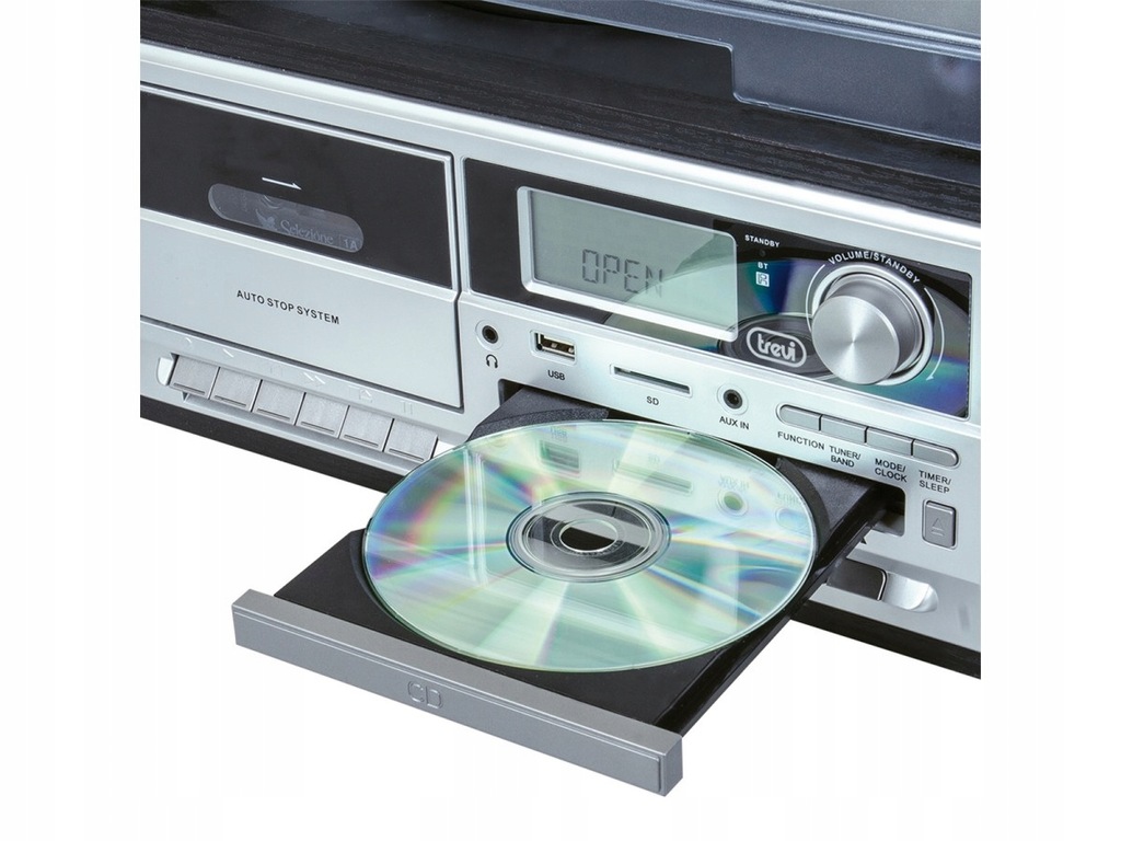 Trevi TT 1072 DAB umożliwia odczyt płyt winylowych 33, 45 i 78 obr./min, a także odczyt plików MP3 z płyt CD, pamięci USB, kart SD, wejścia AUX-IN i komputera, smartfonów i tabletów za pośrednictwem bezprzewodowego połączenia Bluetooth.