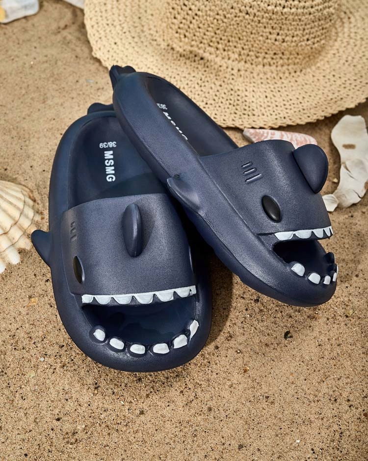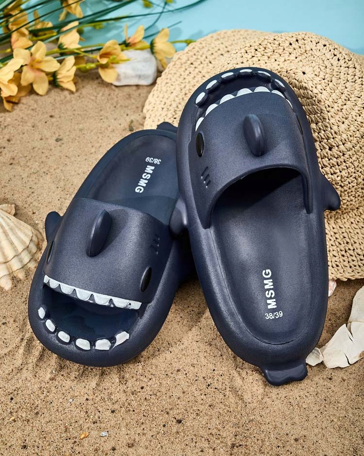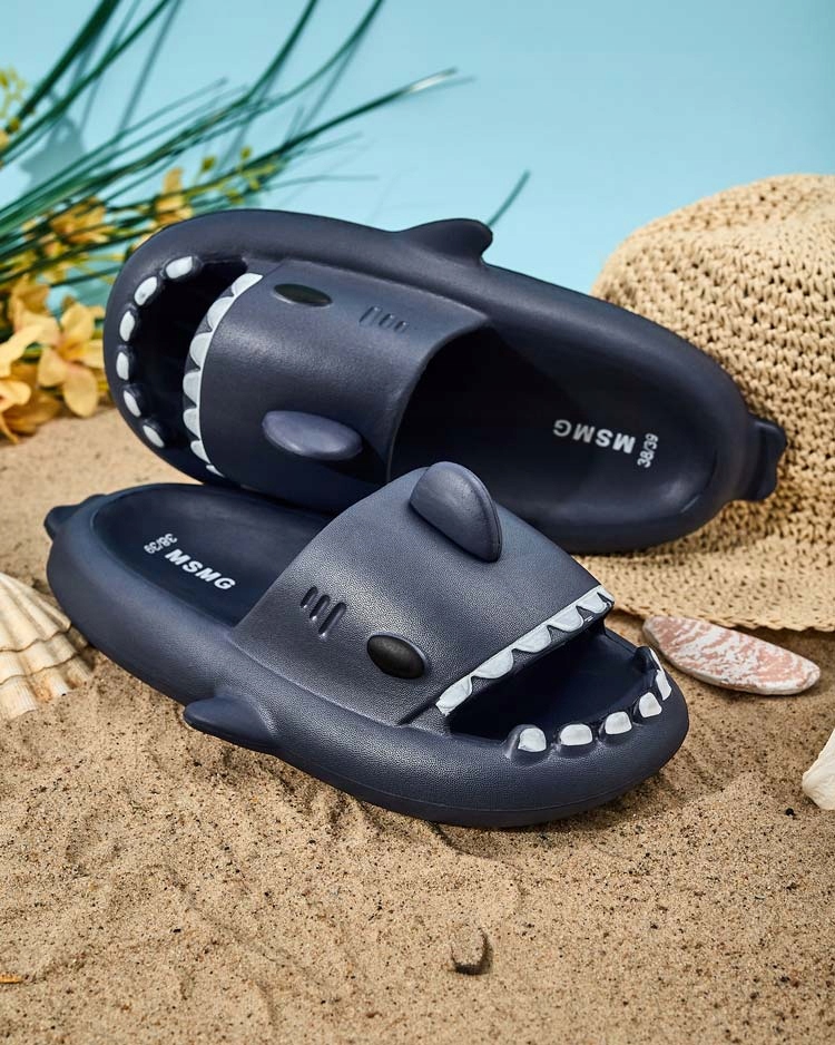 Świetne damskie gumowe klapki na płaskiej podeszwie. Model przypomina rekina! Idealny wybór na wakacje!