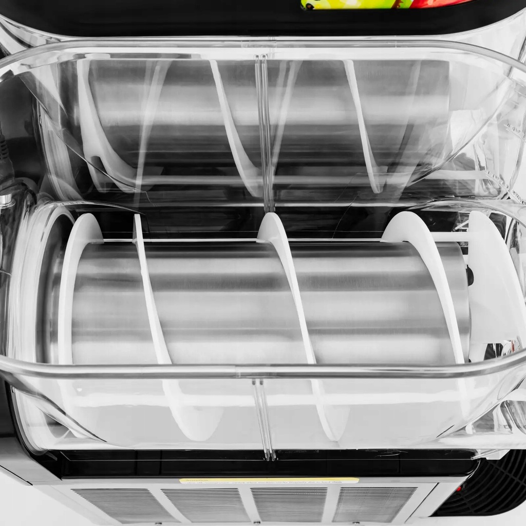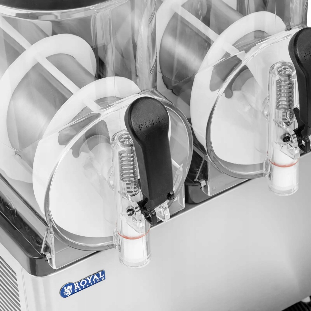 Granitor marki Royal Catering pozwala stworzyć w kawiarni lub barze kolorowe napoje bezalkoholowe, które atrakcyjnie prezentują się z podświetleniem LED. Slushy to także orzeźwiająca atrakcja, która przyciągnie wzrok na festynach, targowiskach czy na basenie! Maszyna pozwala przyrządzić także wszelkiego rodzaju inne zimne napoje, takie jak napoje owocowe, koktajle, a nawet sorbety. Moc maszyny wynosi 680 W, a cykl pracy to od 8 do 16 godzin. Energooszczędny czynnik chłodzący R290 dba o optymalną temperaturę w zakresie od -2 do 10°C, a mieszadło utrzymuje konsystencję bez grudek. Temperatura i funkcje ustawiane są na intuicyjnym, cyfrowym panelu sterowania z wyświetlaczem LED. Urządzenie oferuje 2 pojemniki po 12 litrów każdy do produkcji granity, dzięki czemu można łączyć różne kolory i smaki w jednym urządzeniu. Aby zapewnić atrakcyjną prezentację, pojemniki są wykonane z przezroczystego tworzywa sztucznego niezawierającego BPA i podświetlane efektownymi diodami LED. Mieszadło utrzymuje mrożony napój w ruchu i w magiczny sposób przyciąga klientelę. Duże krany dozujące obsługiwane są z łatwością. Tacki ociekowe utrzymują miejsce pracy w czystości. Pojemniki są zabezpieczone od góry pokrywą.
